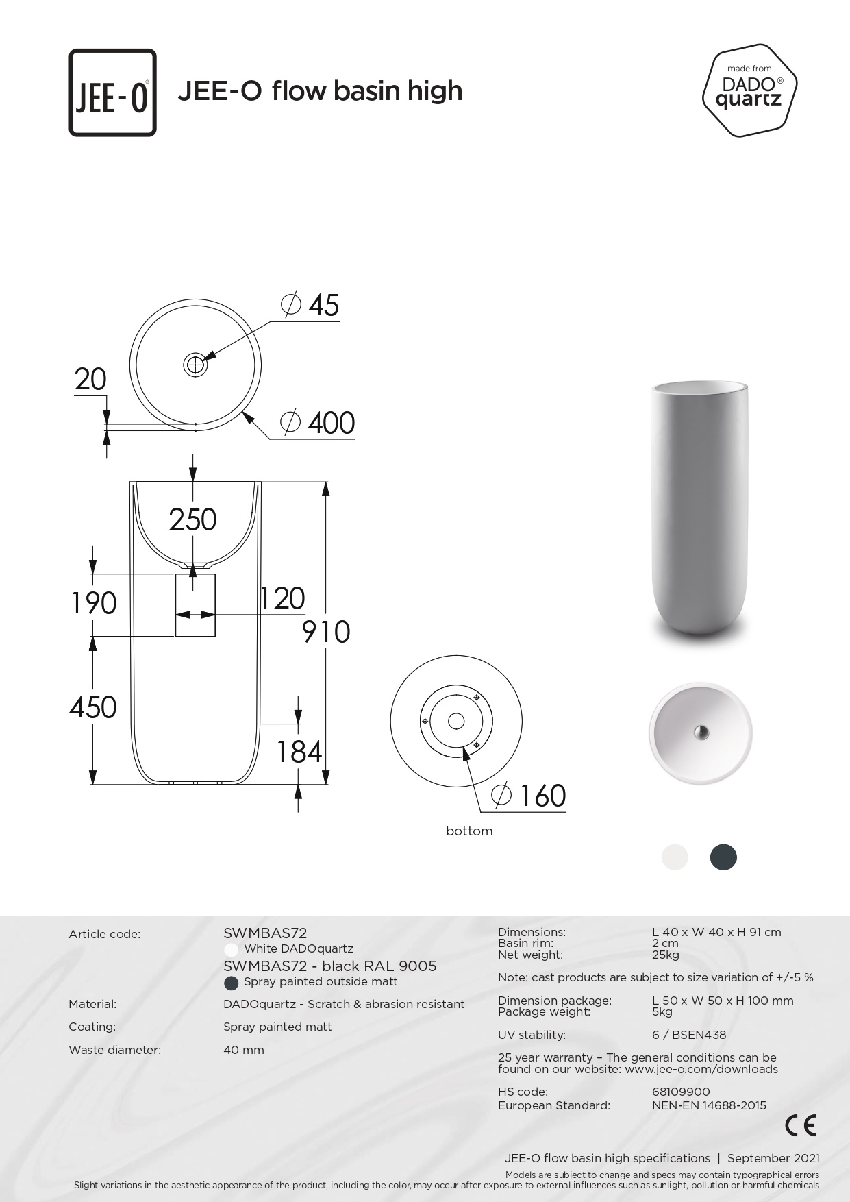 De JEE-O Flow wastafel is vervaardigd van hoogwaardig DADO Quartz materiaal, wat zorgt voor een langdurige duurzaamheid en een luxe uitstraling. De mat witte binnenkant geeft de wastafel een frisse en heldere look, terwijl de terra roze buitenkant een bijzondere en warme touch toevoegt.