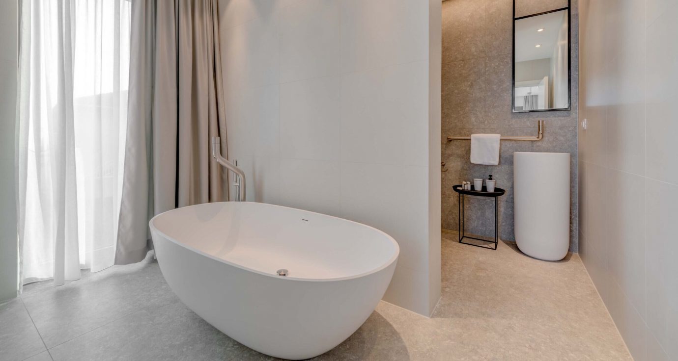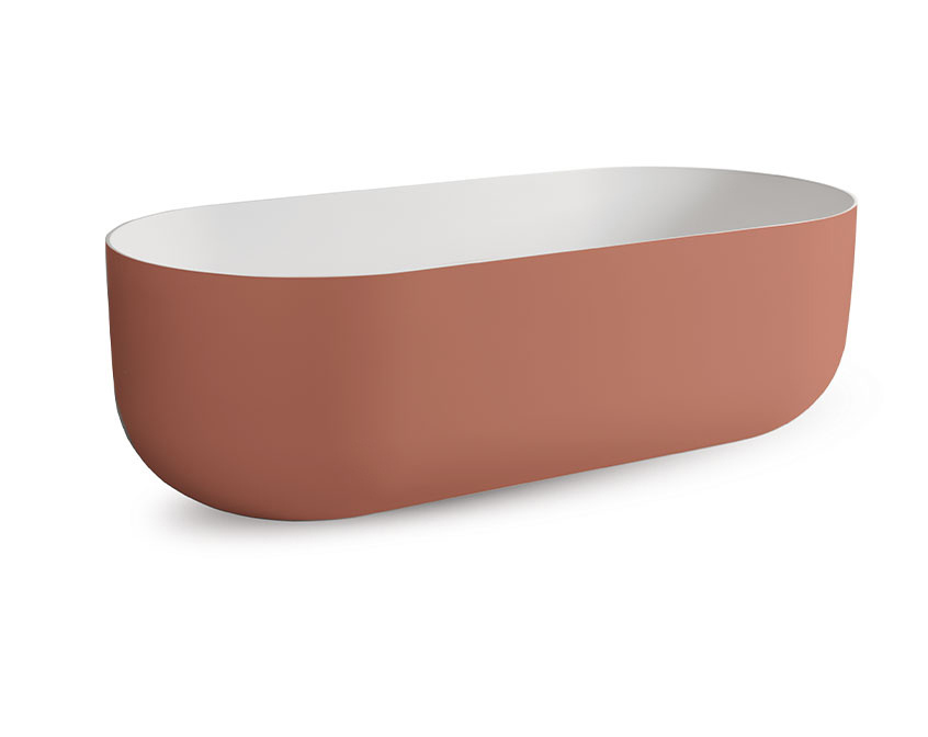 Geniet van een ontspannend bad in de JEE-O Flow vrijstaande badkuip met een moderne uitstraling en een uniek design. Het mat witte interieur zorgt voor een rustgevende en luxe uitstraling terwijl de buitenkant in terra roze kleur voor een speelse en warme sfeer zorgt.