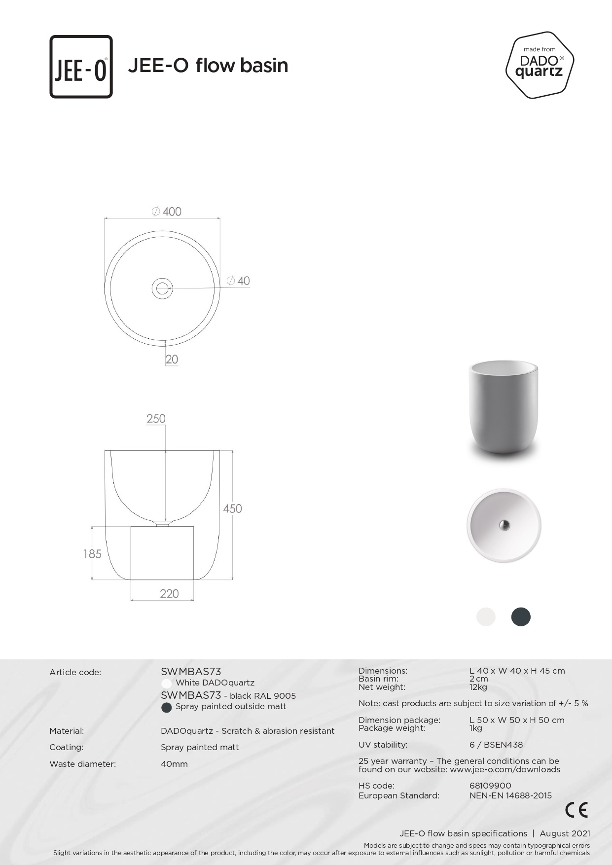 De JEE-O Flow opzetkom wastafel is vervaardigd van hoogwaardig DADO Quartz materiaal, wat zorgt voor een duurzame en kwalitatieve afwerking. De mat witte afwerking geeft de opzetkom een moderne en minimalistische uitstraling, waardoor hij perfect past in eigentijdse badkamers.