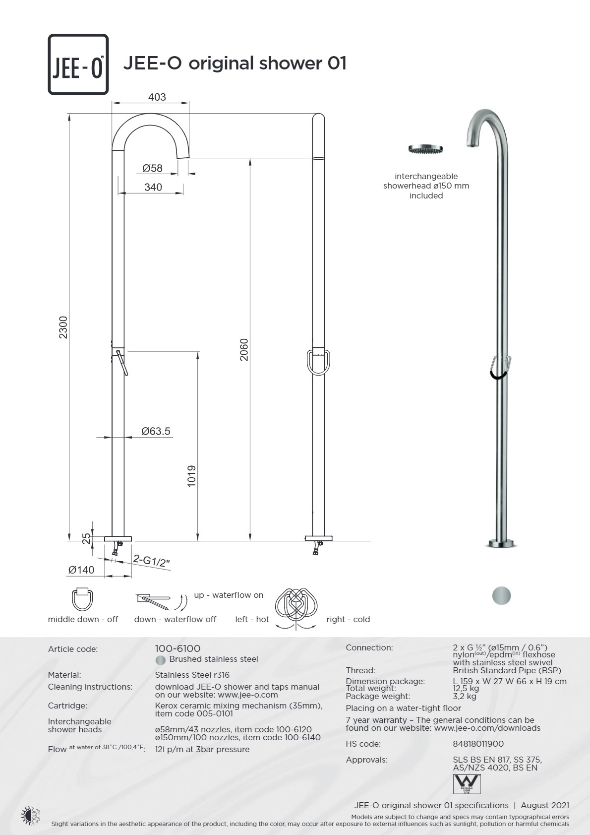 De JEE-O Original 01 Vrijstaande douche is gemaakt van hoogwaardige materialen en is ontworpen om lang mee te gaan. Het geborstelde roestvrij staal is duurzaam en gemakkelijk te reinigen, en de éénngreepsmengkraan is voorzien van hoogwaardige componenten die zorgen voor een soepele en nauwkeurige bediening.