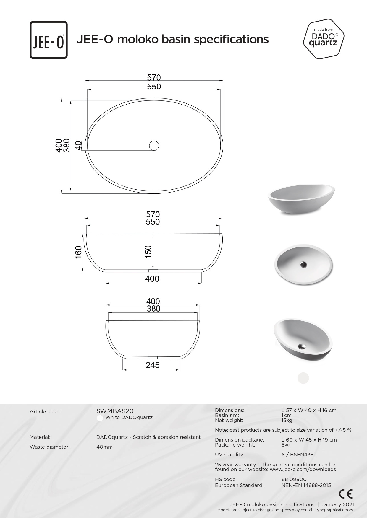Het JEE-O Pure Moloko Basin wordt geleverd zonder kraangat, waardoor je de vrijheid hebt om zelf een kraan naar keuze te installeren. Dit geeft je de mogelijkheid om je eigen persoonlijke stijl en functionaliteit toe te voegen aan de wastafel.