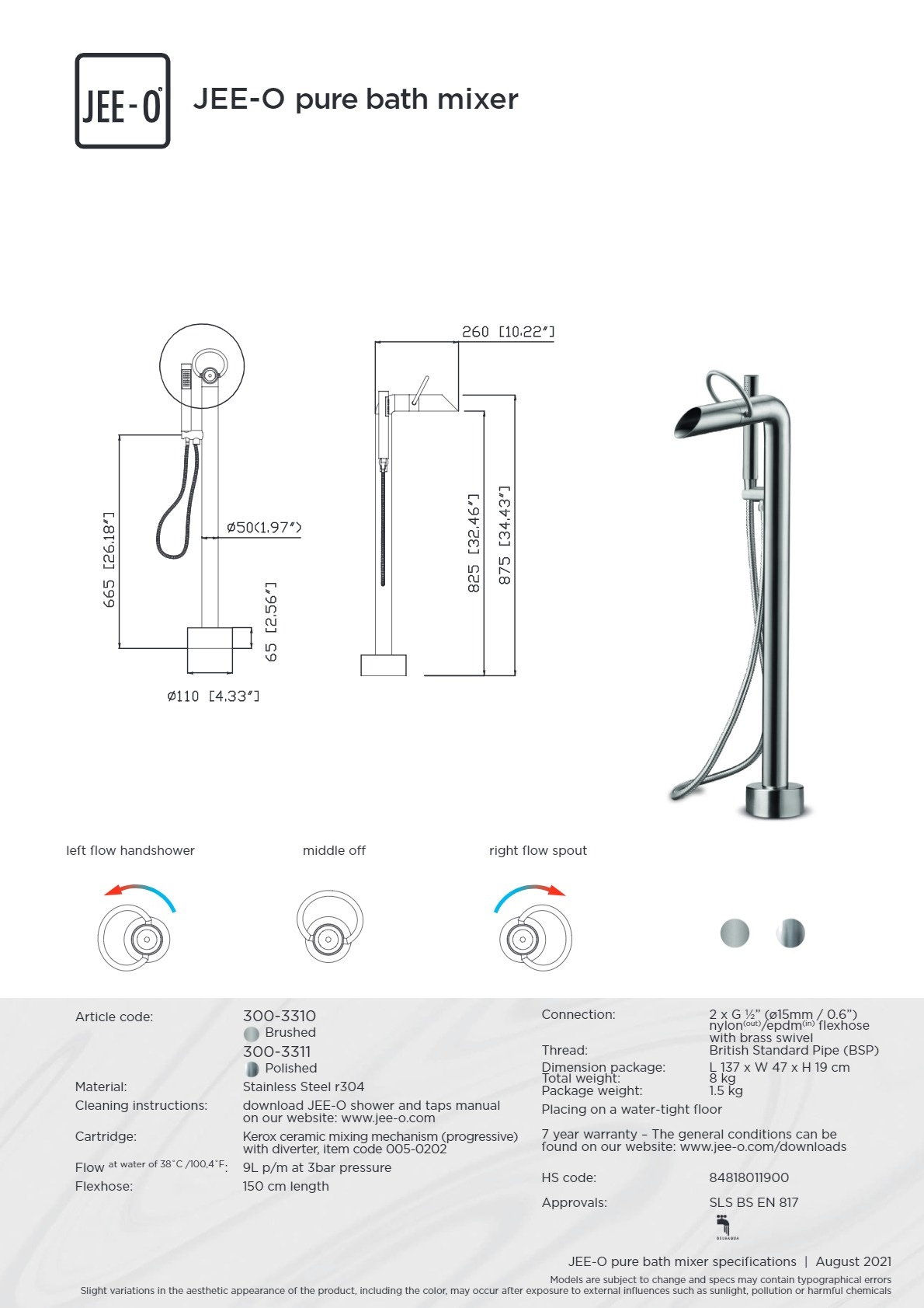 De JEE-O Pure Vrijstaande badvuller is een prachtig ontworpen badvuller die zorgt voor een moderne uitstraling in uw badkamer. Gemaakt van hoogwaardig geborsteld roestvrij staal, is deze badvuller niet alleen mooi om te zien, maar ook duurzaam en van hoge kwaliteit.