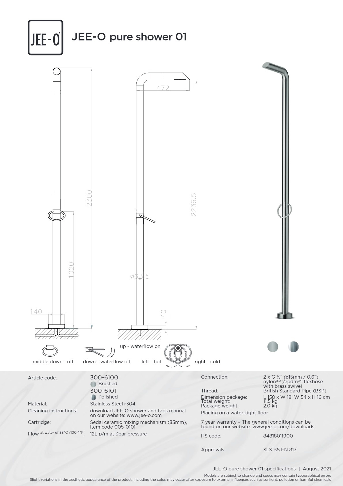 De JEE-O Pure Vrijstaande douche is geschikt voor zowel binnen als buiten en wordt geleverd met een handdouche voor extra gemak. Het vrijstaande design zorgt ervoor dat deze douche op elke gewenste plek in de badkamer geplaatst kan worden en flexibiliteit biedt in de indeling van de ruimte.