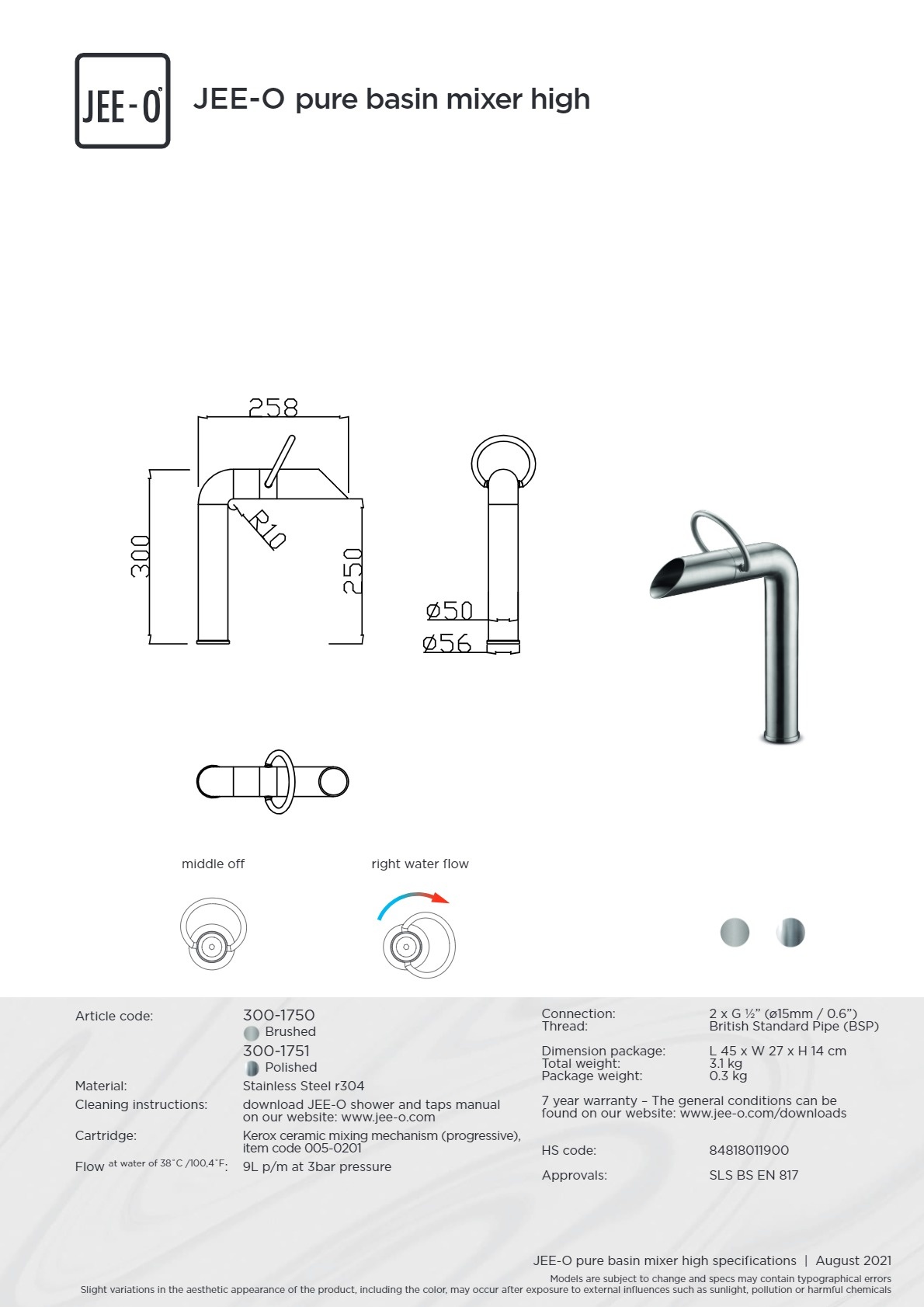 Offerte aanvraag voor JEE-O Pure wastafelkraan - 300-1750 | Geborsteld RVS | hoog