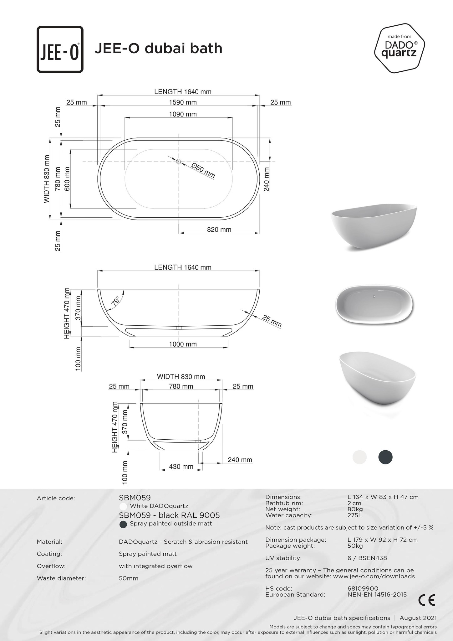 Het JEE-O Slimline Dubai vrijstaand bad is een perfecte keuze als je op zoek bent naar een designbad met een unieke uitstraling. Het bad is niet alleen een lust voor het oog, maar ook nog eens zeer comfortabel dankzij de ergonomische vormgeving. Het bad is geschikt voor twee personen en heeft een afvoer en overloop in het midden.