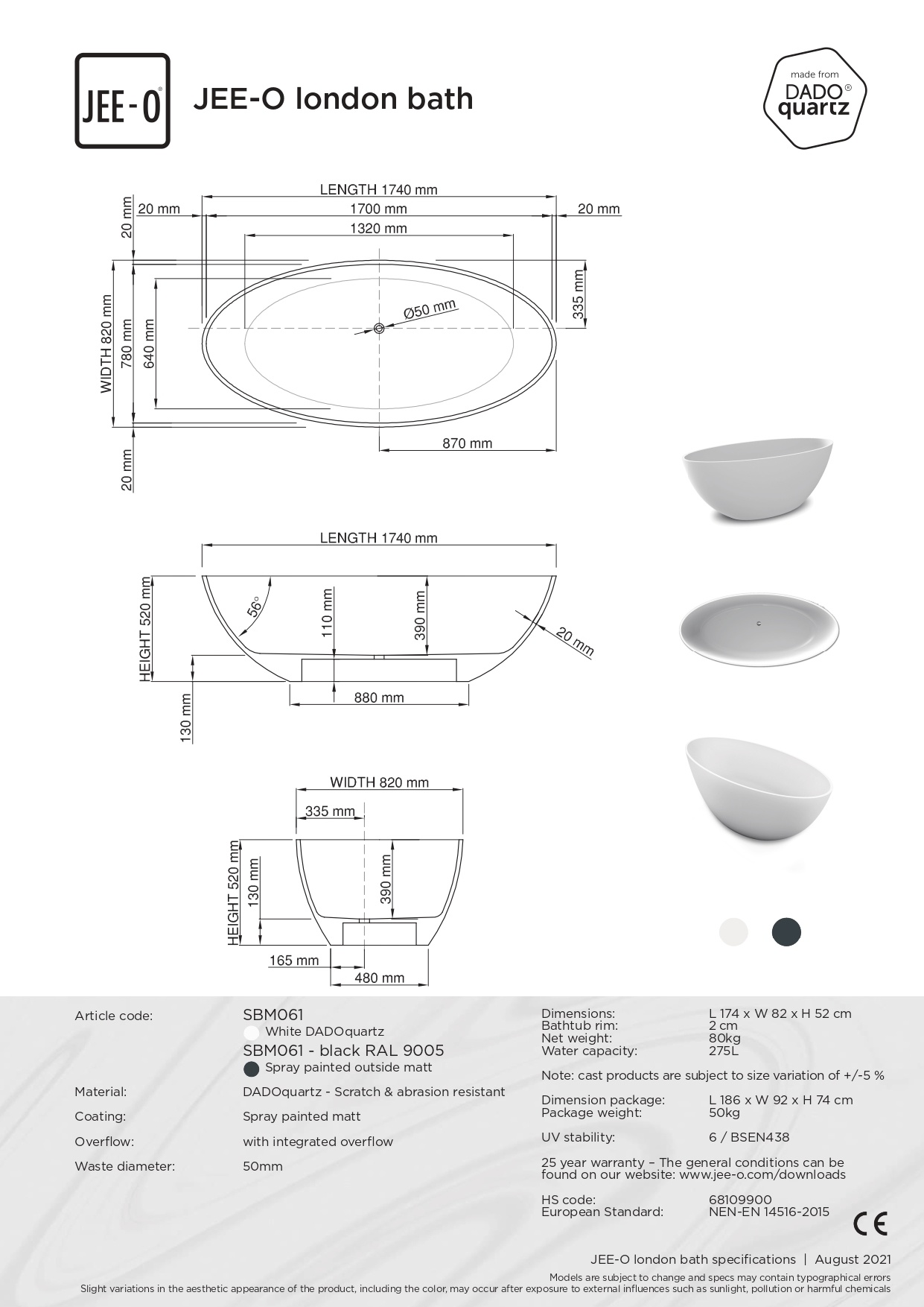 Het JEE-O Slimline London bad is gemaakt van hoogwaardig materiaal en is daardoor duurzaam en slijtvast. De mat witte binnenkant zorgt voor een strakke en tijdloze uitstraling, terwijl de bronzen buitenkant het bad een unieke en luxe uitstraling geeft.