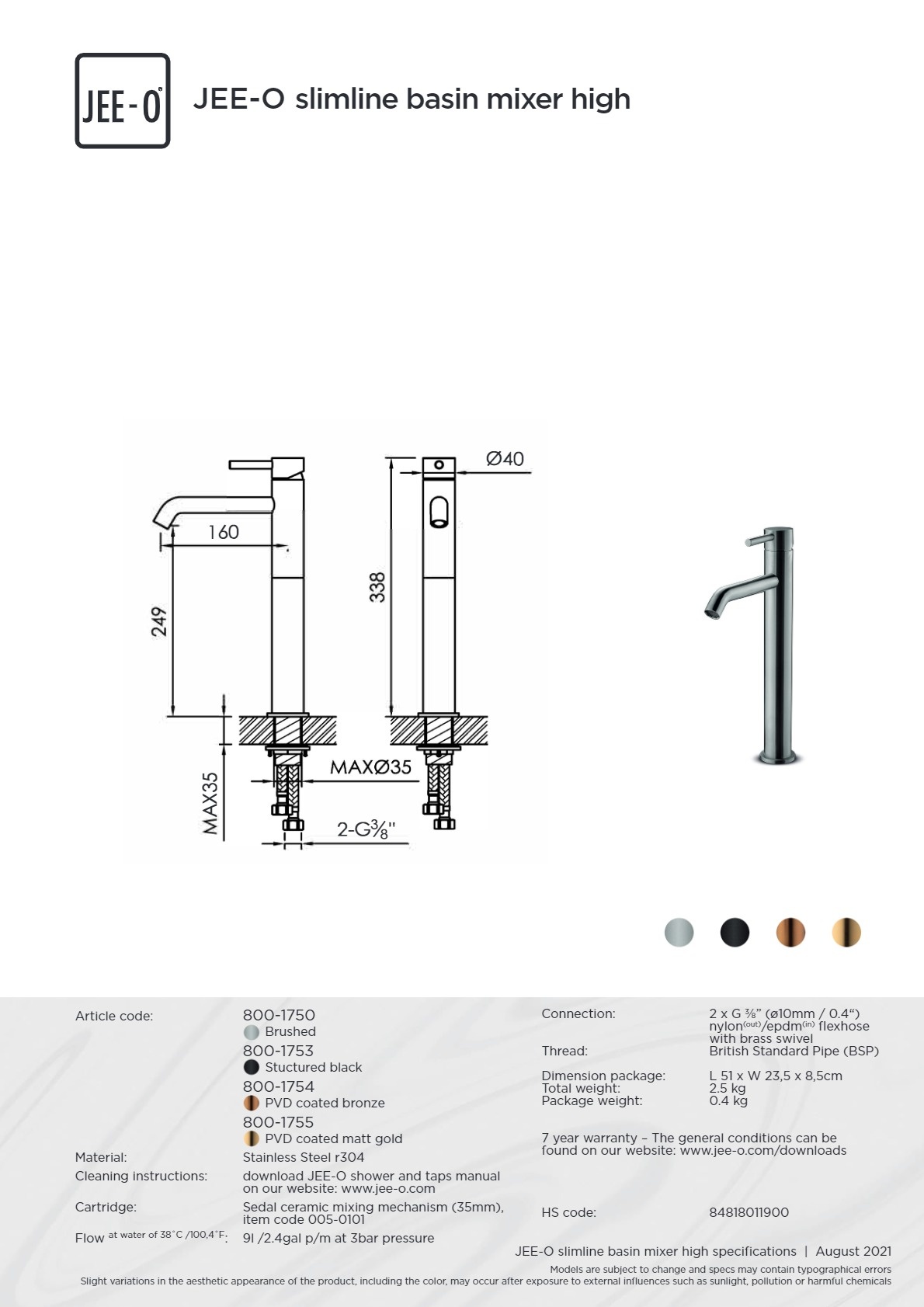 Offerte aanvraag voor JEE-O Slimline Opbouw Wastafelkraan 800-1755 | Mat Goud | Hoog