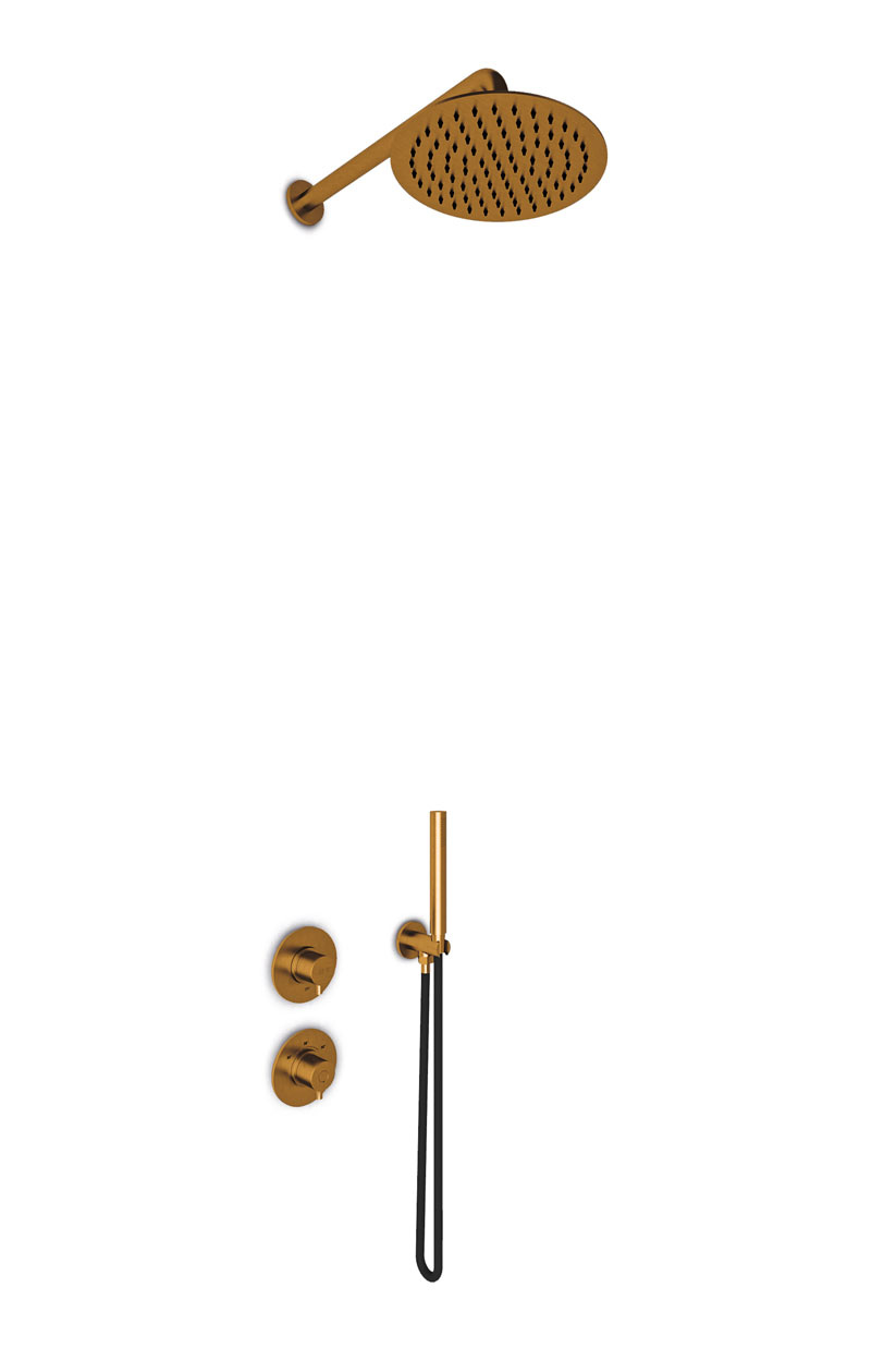 JEE-O Slimline Wand douche combinatie met handdouche, douchekop, klein douchekophouder, omsteller en thermostaat in brons