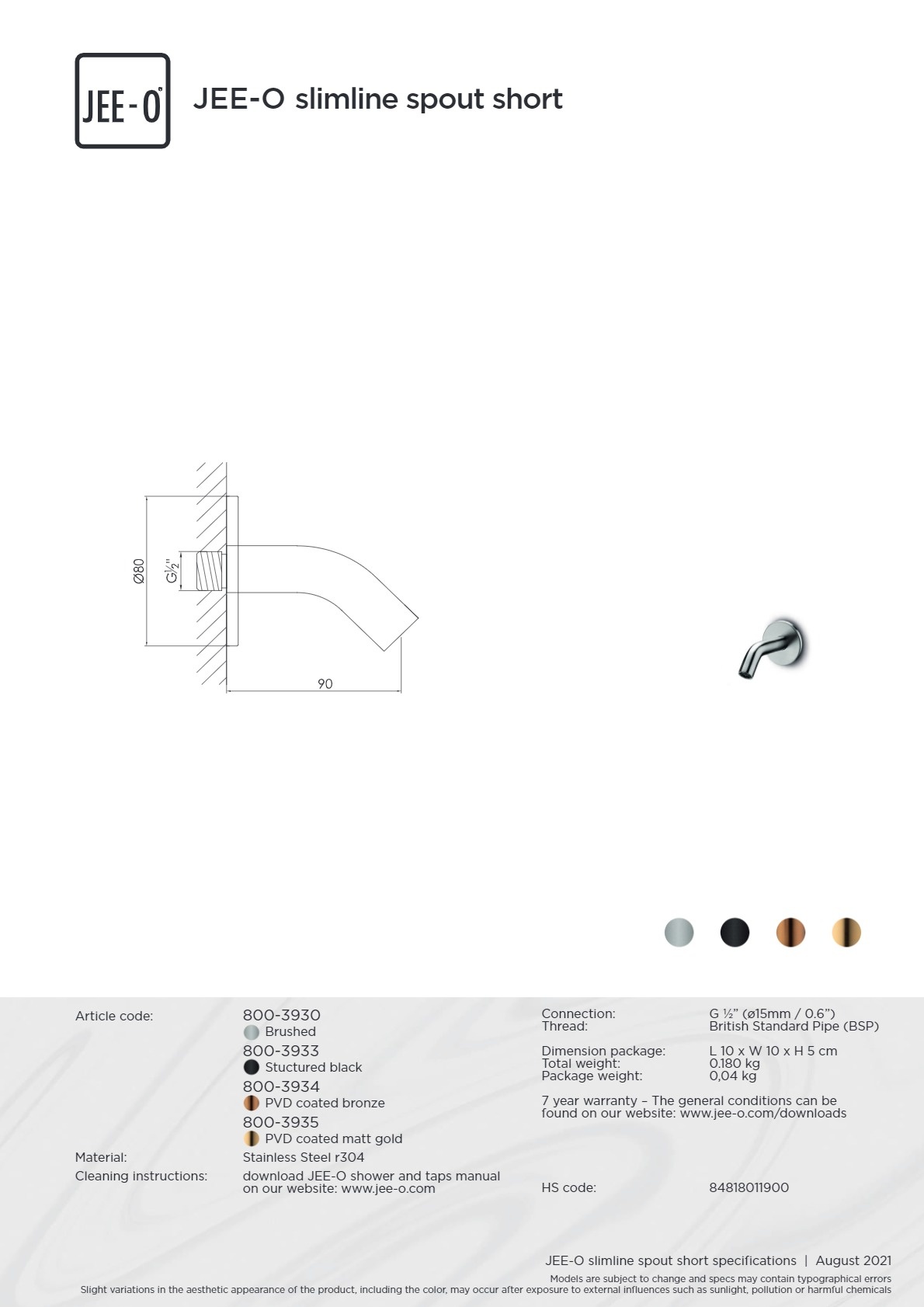 Kortom, ben je op zoek naar een mooie, praktische en duurzame uitloop voor je wastafel of bad? Kies dan voor de JEE-O Slimline Wand uitloop kort 9 cm in mat goud. Bestel hem vandaag nog en geniet van een heerlijke douche- of badervaring in stijl!