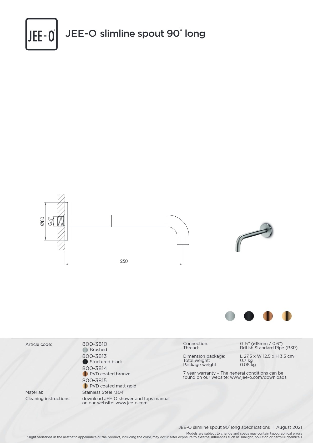 JEE-O Slimline Wand Uitloop 90° 800-3810 | Geborsteld RVS | 25cm