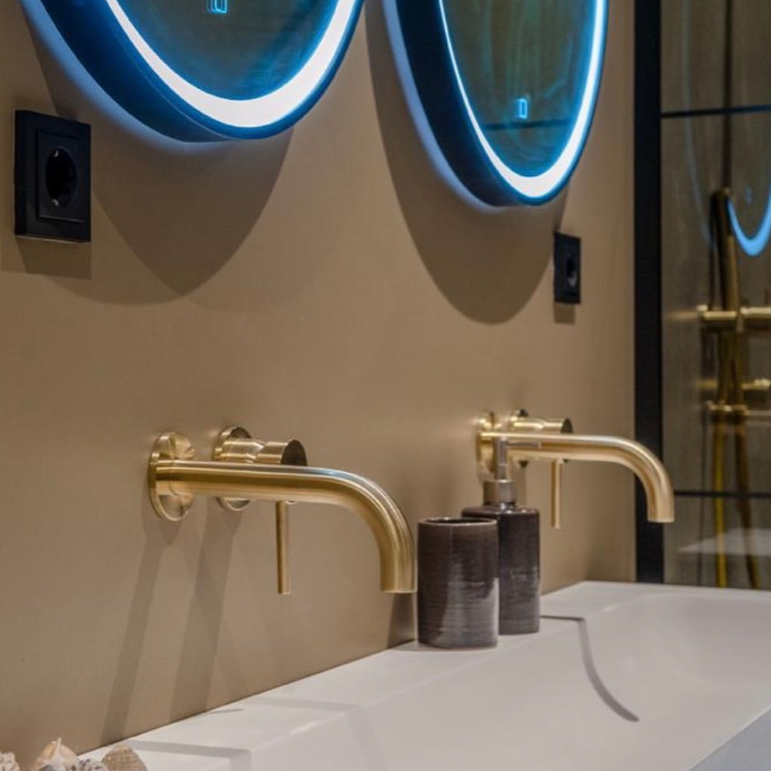 Met de JEE-O Slimline Wand wastafelkraan met inbouwdeel en 90 graden uitloop in mat goud creëer je een echte eyecatcher in jouw badkamer!