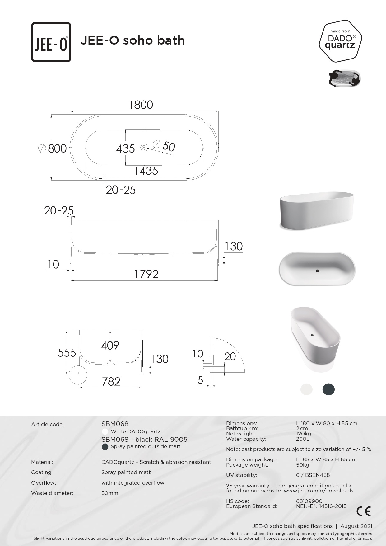Geniet van een heerlijk bad met het JEE-O Soho vrijstaande bad. Het mat witte design geeft een moderne en strakke uitstraling in je badkamer. Het bad is gemaakt van hoogwaardig solid surface materiaal, wat zorgt voor een duurzaam en onderhoudsvriendelijk product.