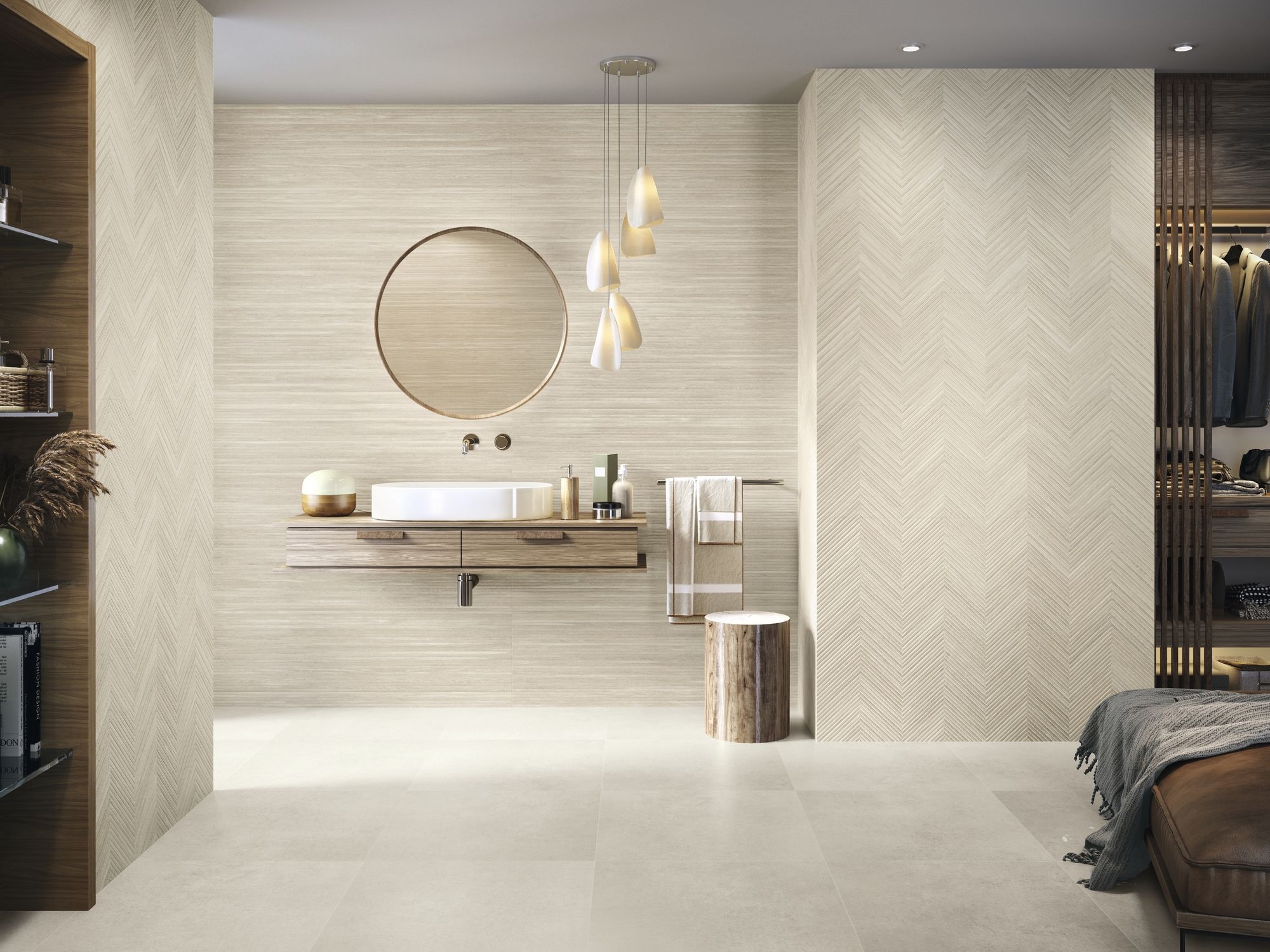 Met Larchwood Zig Maple 40x120 rett keramische wandtegels creëert u een luxe en ruimtelijke sfeer, dankzij de lichte, beige kleurnuances en het grote formaat.