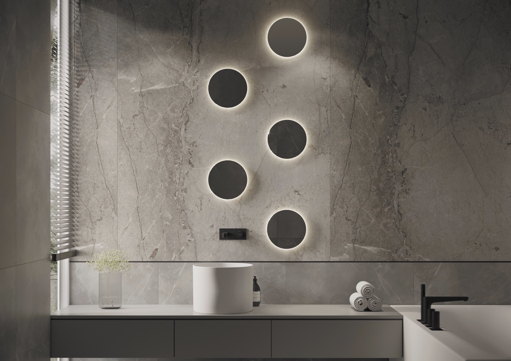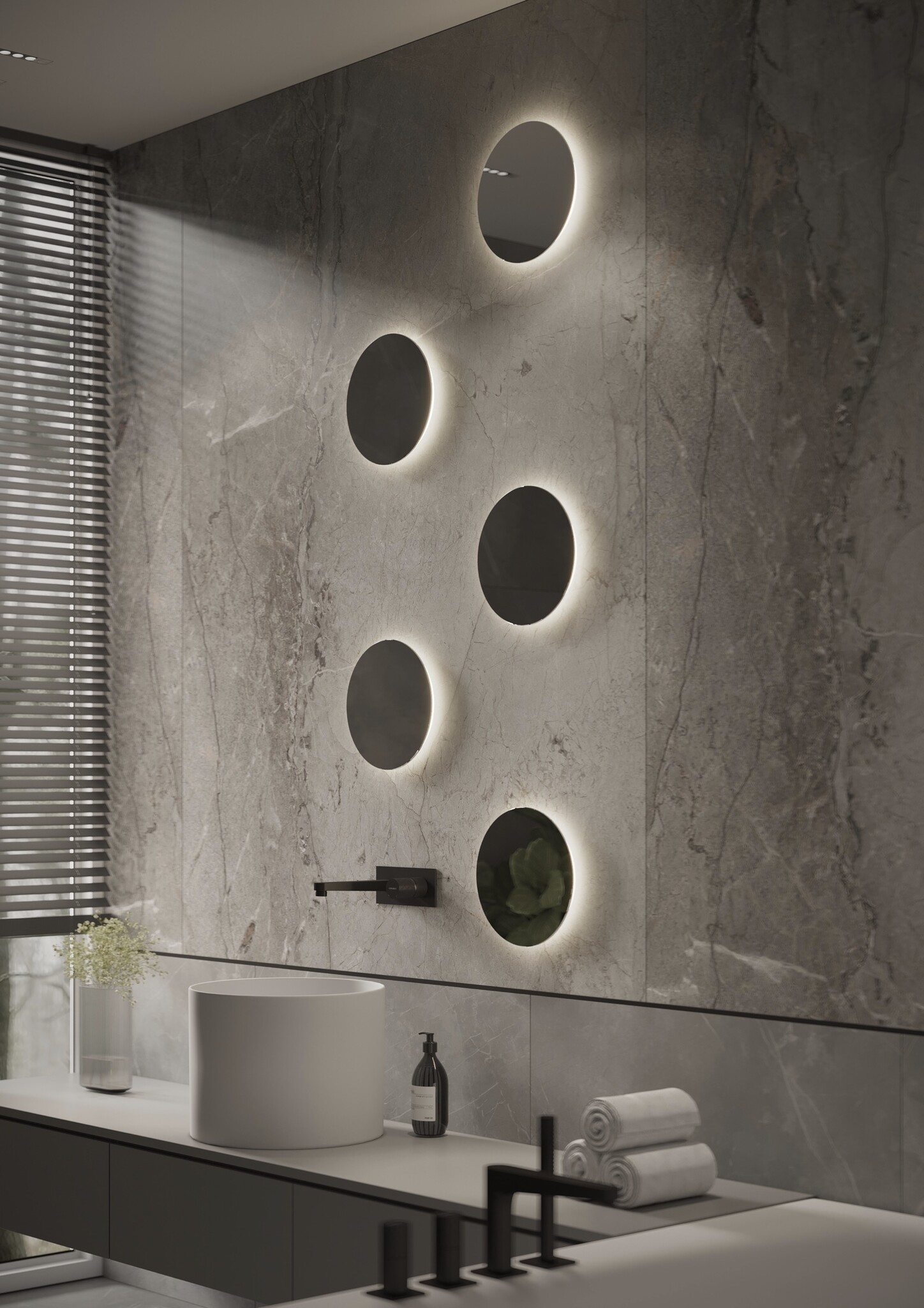 De Martens Design Ronde Set Spiegels uit de Florida Serie transformeert je badkamer in een oase van luxe. Deze set van vijf spiegels met een diameter van 40 cm komt met indirecte verlichting, wat zorgt voor een moderne uitstraling.