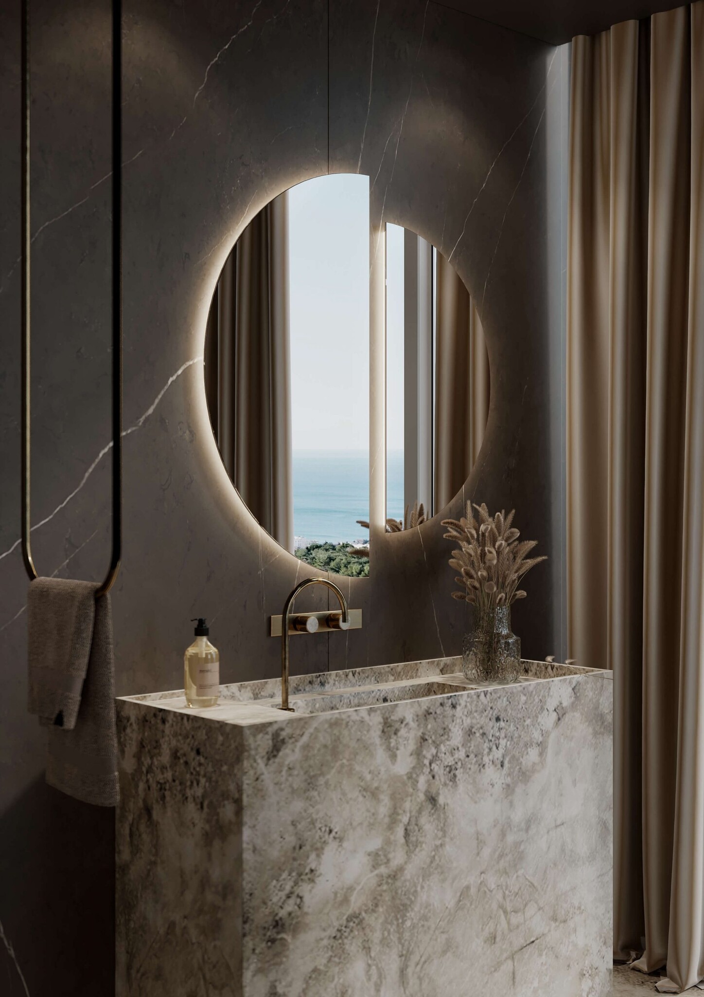 De Martens Design Spiegel uit de Moon Serie biedt een uniek ontwerp met ronde spiegel en halve cirkels. Ideaal voor moderne badkamers.
