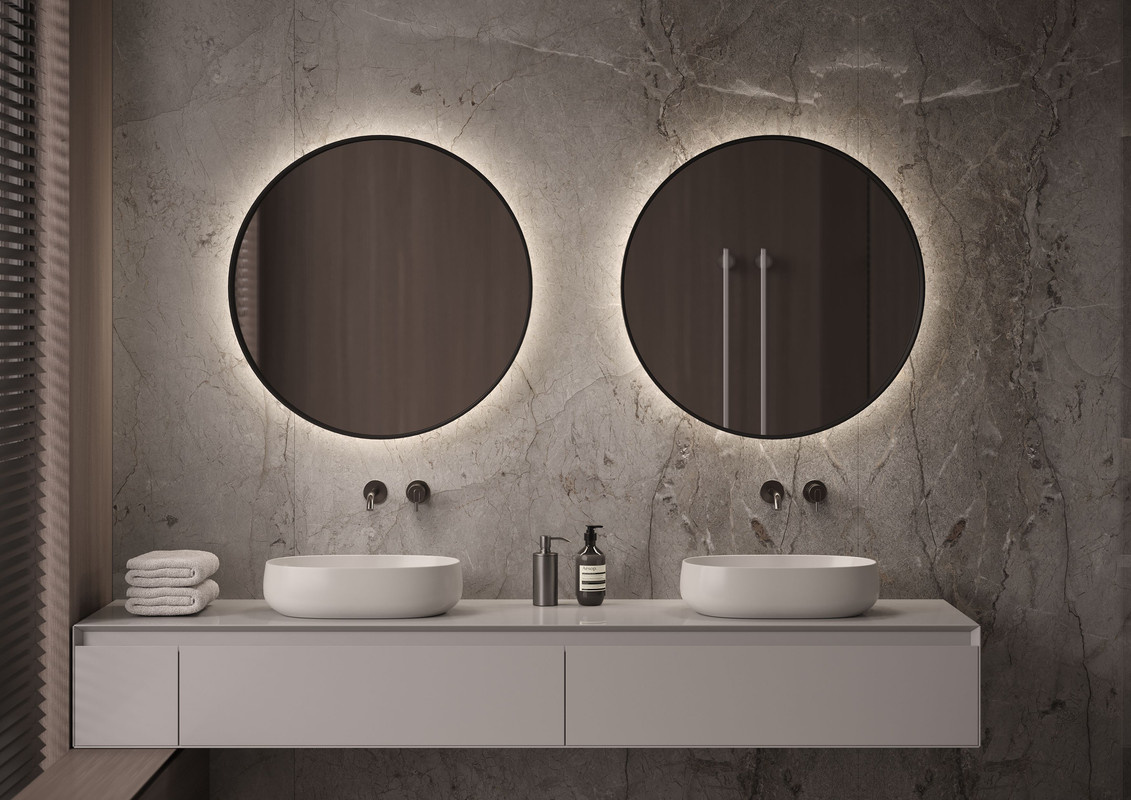 Ontdek de Martens Design Spiegel, een ronde spiegel van 60 cm in mat zwart met geïntegreerde LED-verlichting en verwarming voor een moderne badkamer.