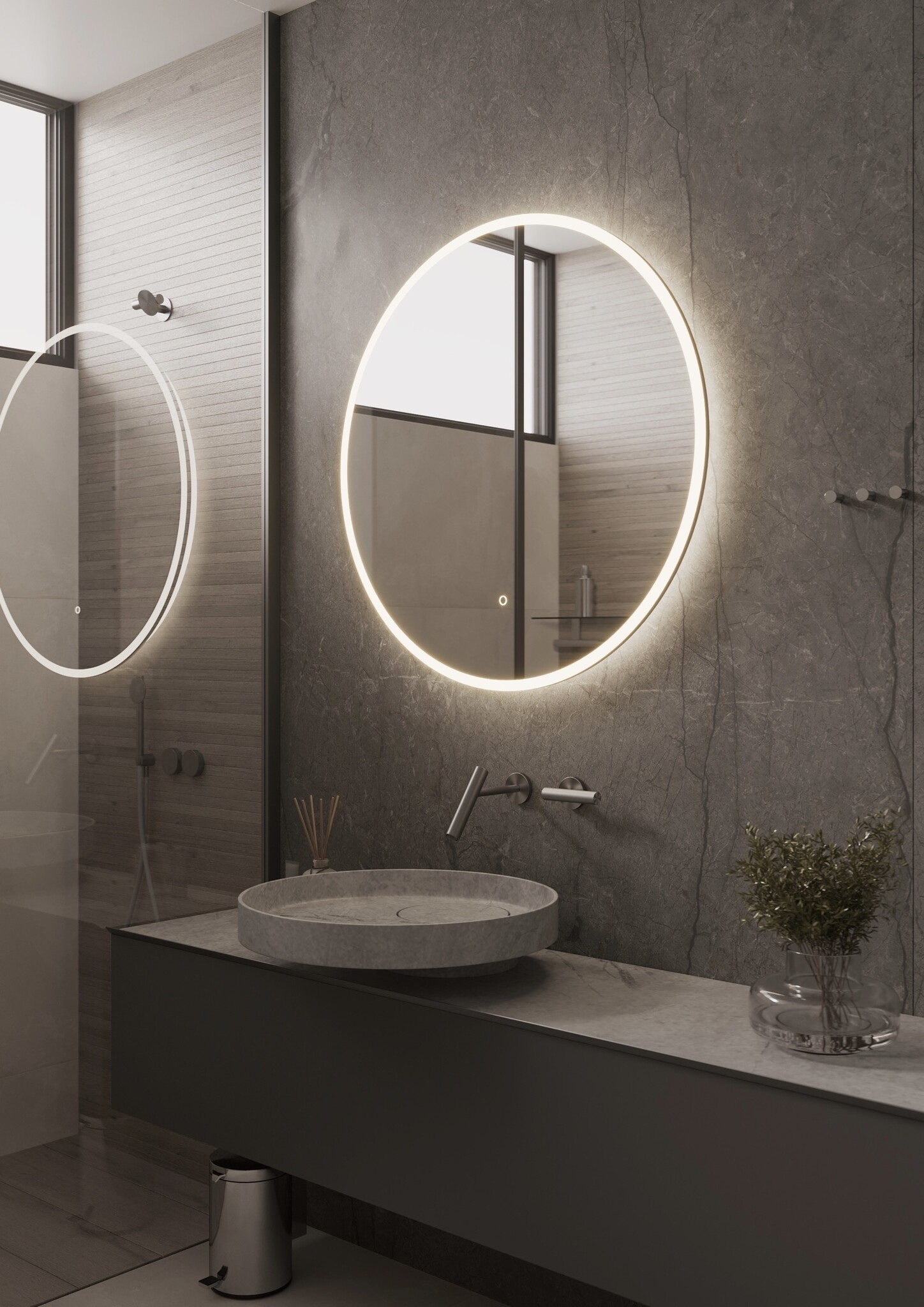 Welkom bij Martens Design, waar onze luxe spiegels een statement maken in jouw huis! Deze ronde spiegel van Ø 80 cm uit de Porto Serie heeft ingebouwde LED-verlichting en spiegelverwarming. Het strakke en minimalistische ontwerp voegt een vleugje elegantie en luxe toe aan je dagelijkse routine. De subtiele ronde vorm zorgt voor een tijdloze uitstraling die elke badkamerstijl aanvult.
