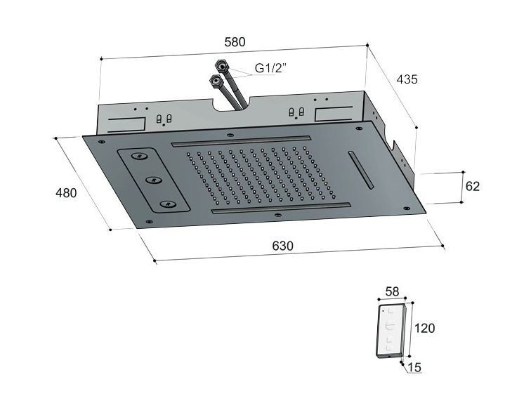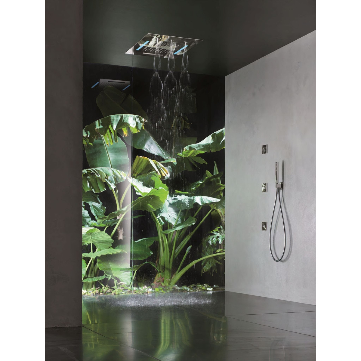 De hoofddouche heeft een royaal formaat van 48 bij 63 cm, waardoor u volledig omringd wordt door water. Het inbouwmodel wordt geleverd inclusief frame voor een strakke afwerking in uw douchecabine. De LED-verlichting is subtiel verdeeld over de nozzles, waardoor er een prachtig lichteffect ontstaat bij elke douchestraal.