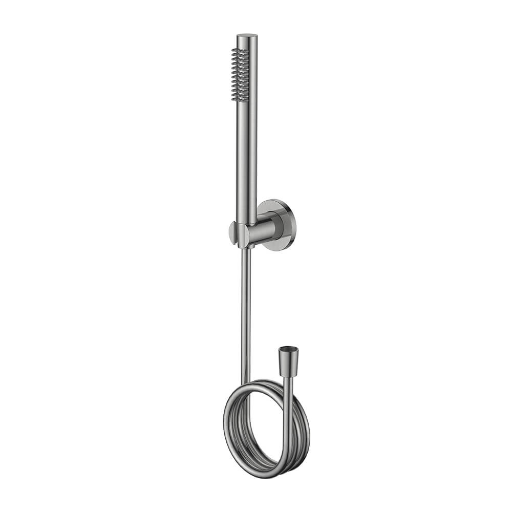 Deze Regn badset, uitgevoerd in de kleur geborsteld nikkel, is minimalistisch vormgegeven. De handdouche kan eenvoudig op de muur gemonteerd worden, waardoor je deze altijd bij de hand hebt. Zowel de slang, handdouche én de handdouchehouder worden geleverd inéén en dezelfde kleur.