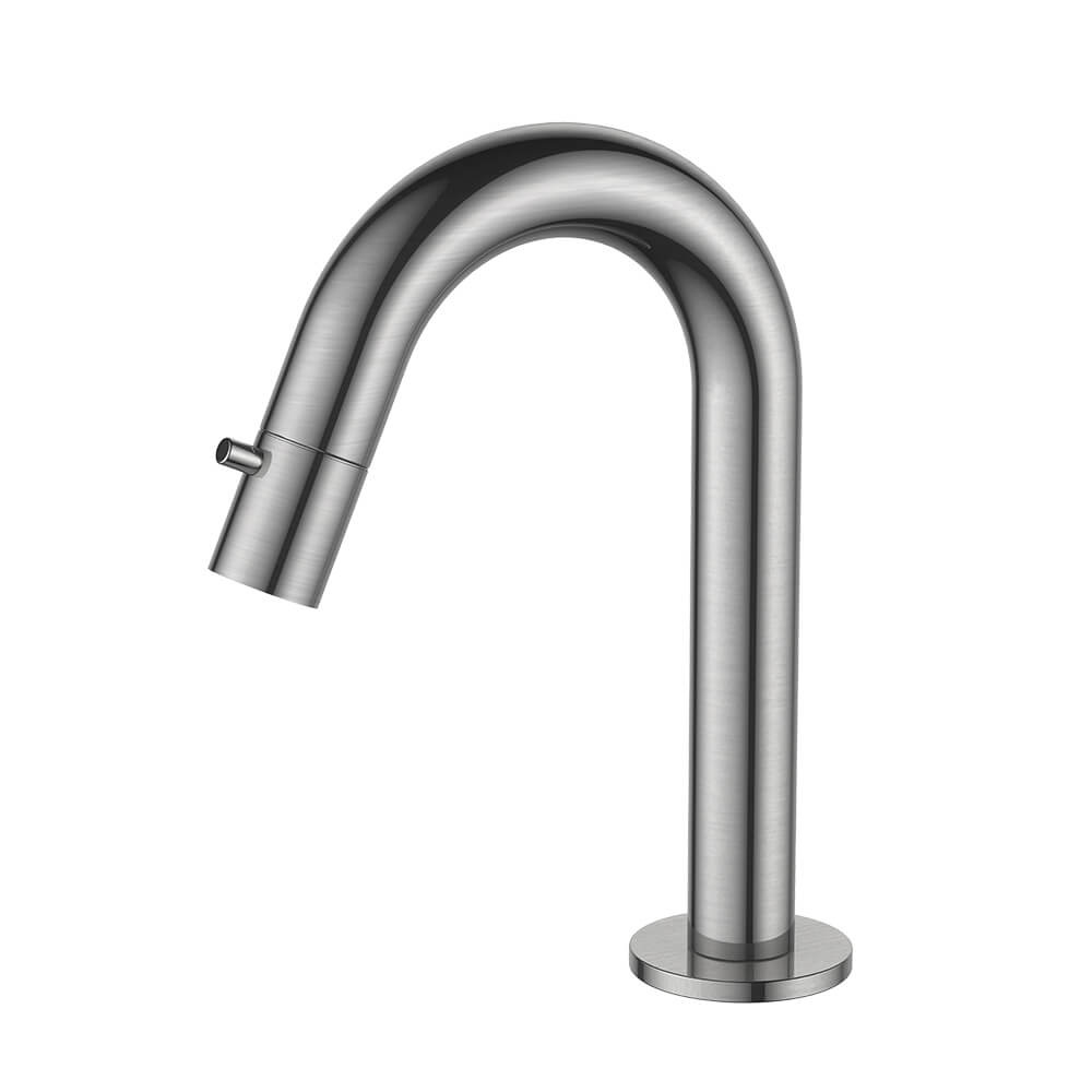 De bediening bevindt zich aan het uiteinde van de kraan. De kleurafwerking van de fonteinkraan is geborsteld nikkel maar is ook verkrijgbaar in 5 andere kleurafwerkingen; Chroom, geborsteld goud, Geborsteld koper, Mat Zwart en gun metal Zwart. De hoogte van de fonteinkraan is 19,3 centimeter, een echte blikvanger.