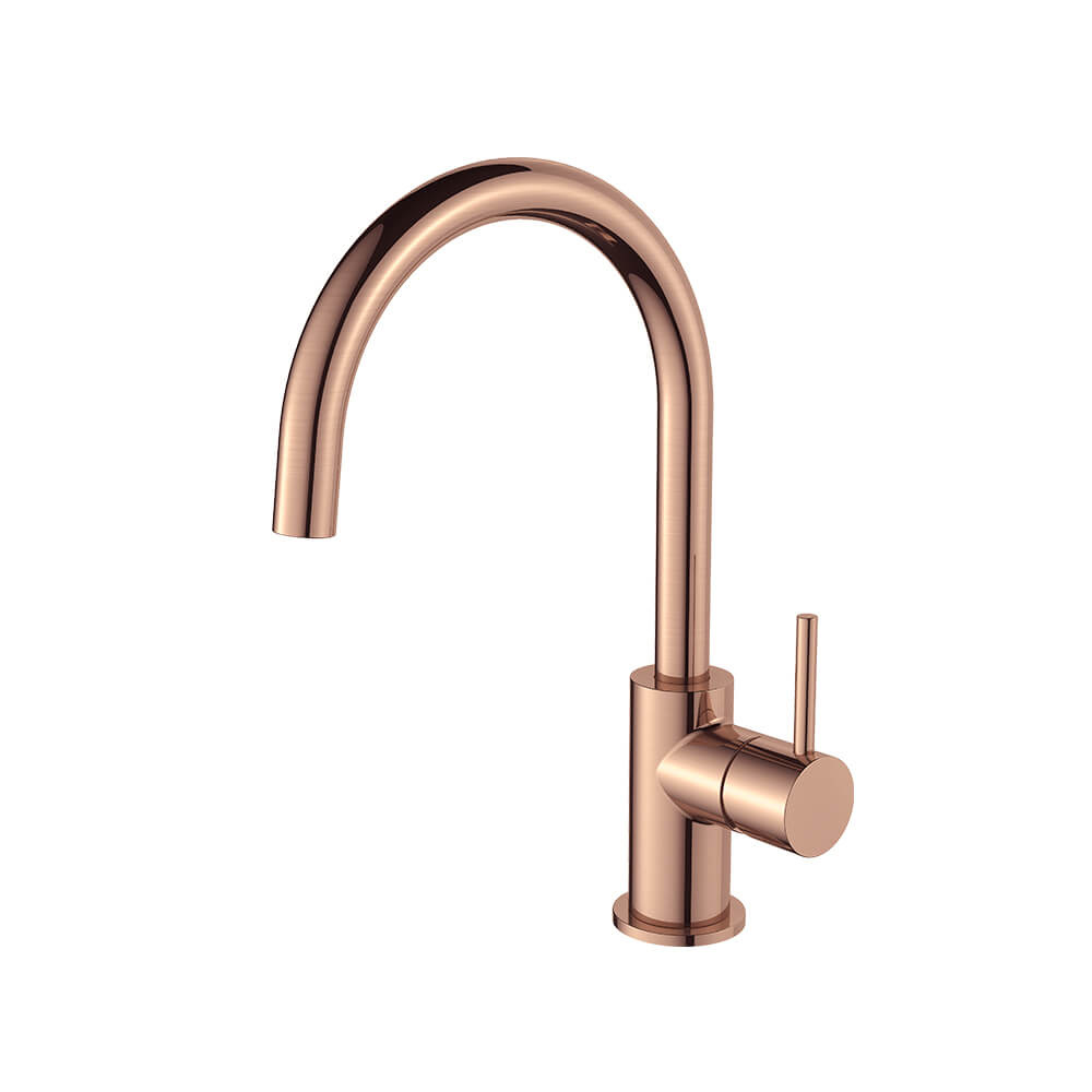 Deze Regn keukenmengkraan, uitgevoerd in de kleur Geborsteld koper, is een fraaie eenhendelkraan met een gebogen uitloop die in de keuken perfect bij de gootsteen past. Dankzij de keramische cartouche is de kraan probleemloos te bedienen. De 31,6 cm hoge kraan is voorzien van een 18,3 cm lange gebogen uitloop, waardoor er voldoende ruimte is om de handen te wassen of zelfs een emmer met water te vullen.