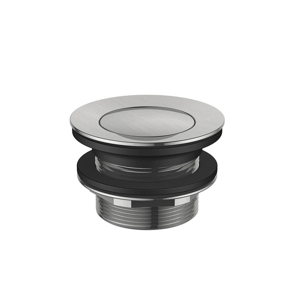Deze Regn badafvoerplug, uitgevoerd in de kleur geborsteld nikkel heeft een diameter van 69 mm en een 1 1/2" buitendraad aansluiting. De badafvoerplug is voorzien van een pop-up mechanisme. Hiermee opent en sluit de afvoerplug, heel gemakkelijk,ë met een druk op de knop.