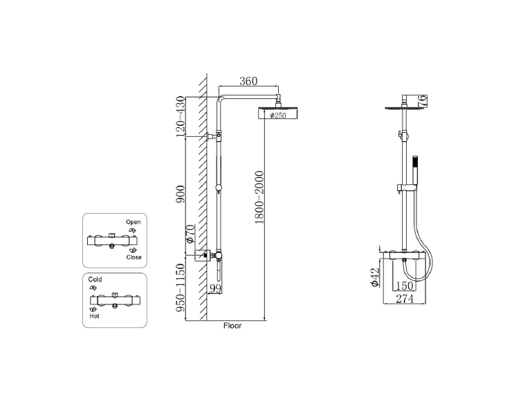 De glijstang is verstelbaar van 95 tot 115 centimeter en ook het glijstuk kan op de gewenste hoogte geplaatst worden. De staafhanddouche is 18,5 centimeter en heeft een diameter van 2,8 centimeter. De hoofddouche heeft een diameter van 25 centimeter.
