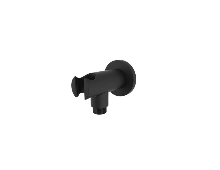 De ronde Regn wandaansluitbochtë met houder, uitgevoerd in de kleur Mat Zwart, past perfect bij de Regn handdouche in dezelfde kleur. Onderaan zit een wateruitlaat, waar een doucheslang met 1/2"ë aansluiting aan bevestigd kan worden (los bij teë bestellen). Het waterë stroomt dan via de houder zo de doucheslang in, richting de handdoucheë (los bij te bestellen).