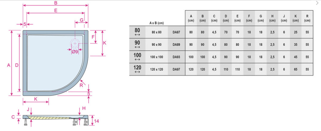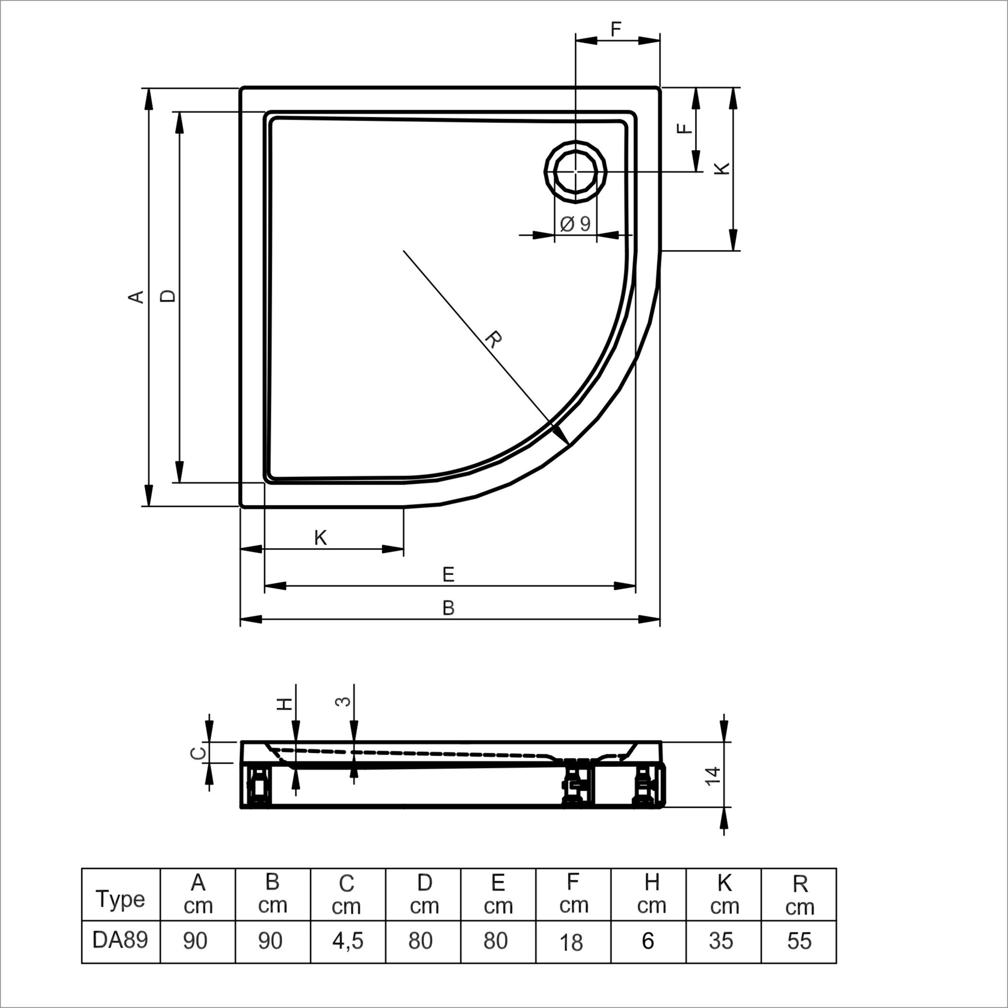 Dankzij de dikke bodemplaat en de meegeleverde poten en panelen, is deze douchebak eenvoudig te installeren en biedt hij extra stabiliteit. De kwartronde vorm en radius van 55 graden maken het een ideale keuze voor compacte badkamers.