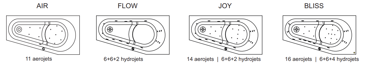Het Riho Delta inbouwbad kan worden uitgebreid met verschillende whirlpoolsystemen voor een ultieme badervaring: