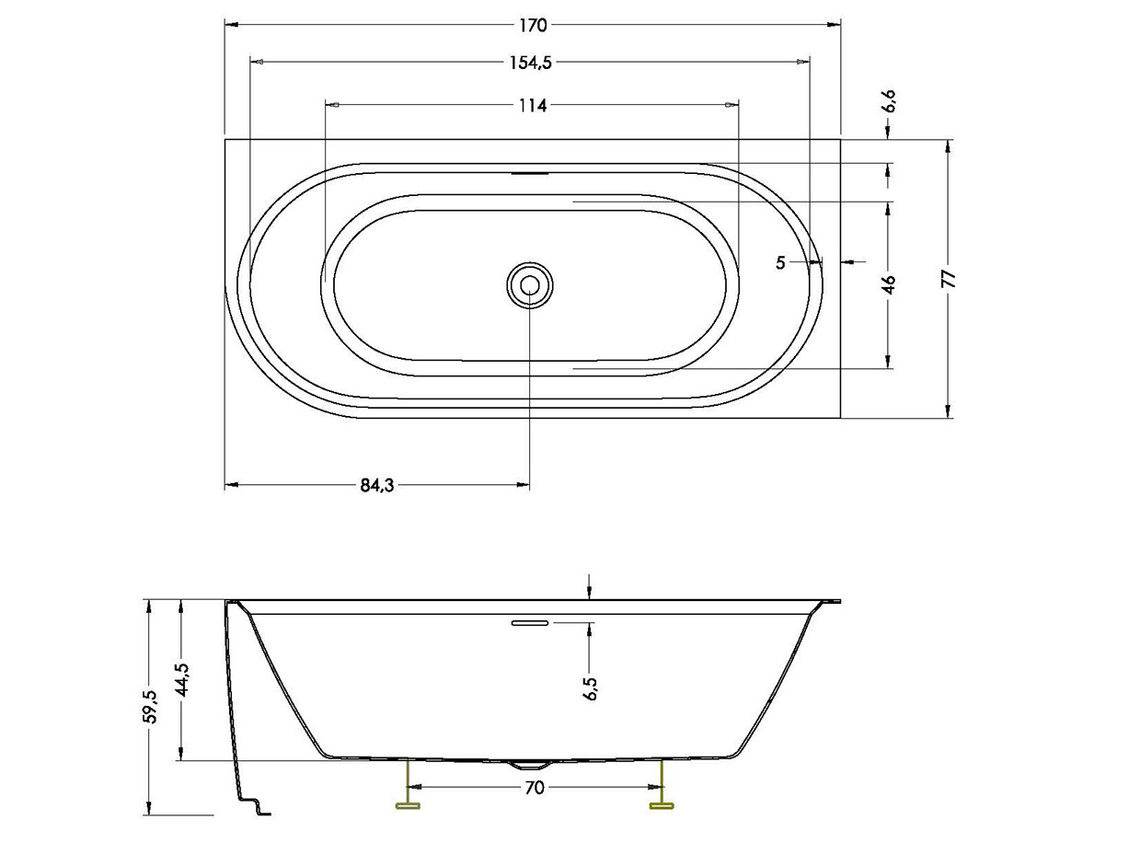 De ovale binnenvorm zorgt voor extra ligcomfort. Het bad wordt standaard geleverd met badpoten, badafvoer met klikplug en overloopcover in chroom. De afvoerplug en overloop zijn handig in het midden geplaatst voor optimale waterafvoer.
