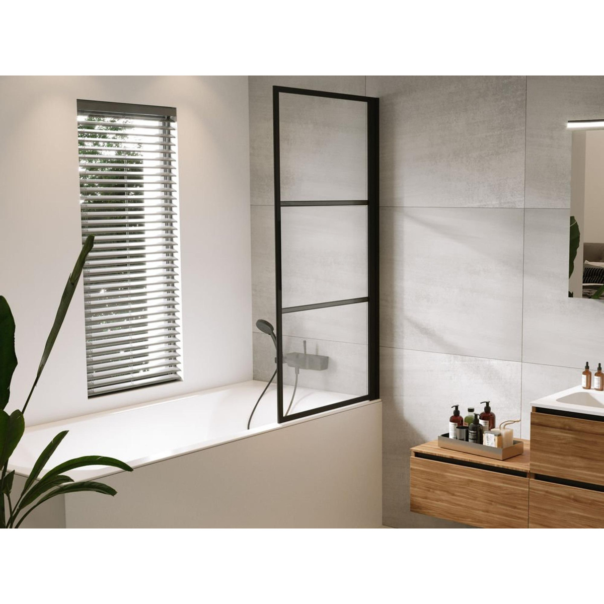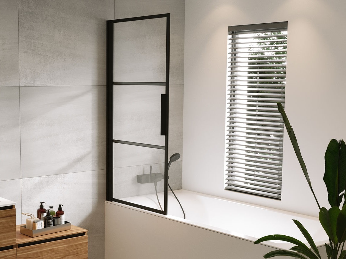 De Riho Grid GB501 is een mat zwarte badwand met een industriële uitstraling. Het glas is volledig ingesloten in gepoedercoat aluminium profielen, wat zorgt voor hoge stabiliteit en een moderne look. De horizontale metalen stroken aan de buitenkant verdelen het glas in drie vlakken, terwijl de maskerende opdruk aan de binnenzijde het schoonmaken vergemakkelijkt.