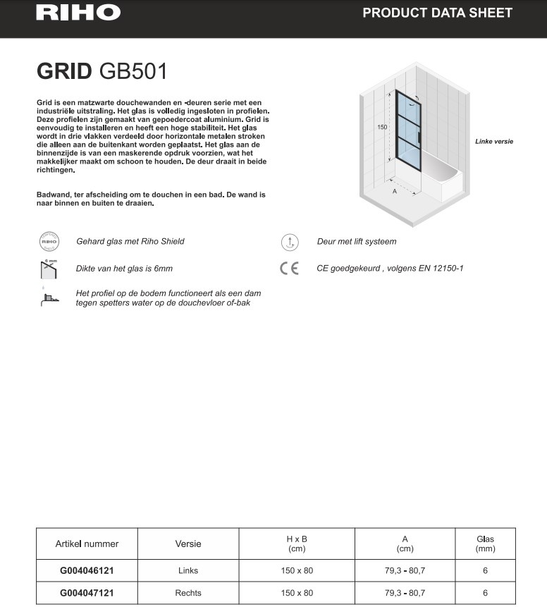Deze badwand is gemaakt van gehard glas met Riho Shield, wat extra veiligheid biedt. De glasdikte van 6 mm zorgt voor stevigheid en duurzaamheid. Het profiel op de bodem functioneert als een dam tegen spetters water, en de deur met liftsysteem maakt het gebruik eenvoudig. De wand is naar binnen en buiten te draaien, wat flexibiliteit biedt tijdens het douchen.