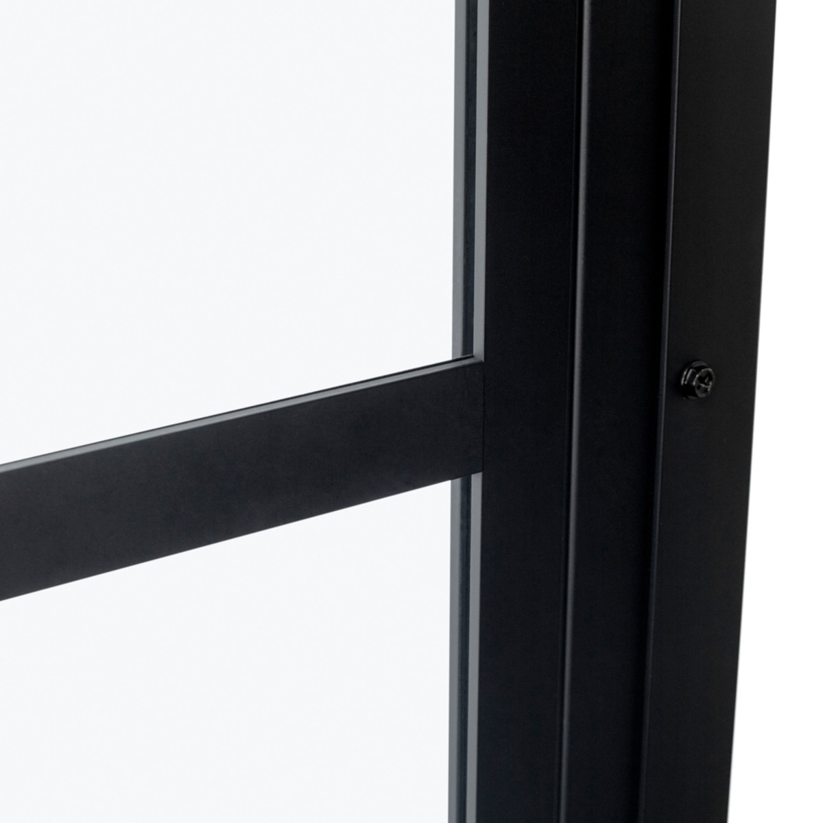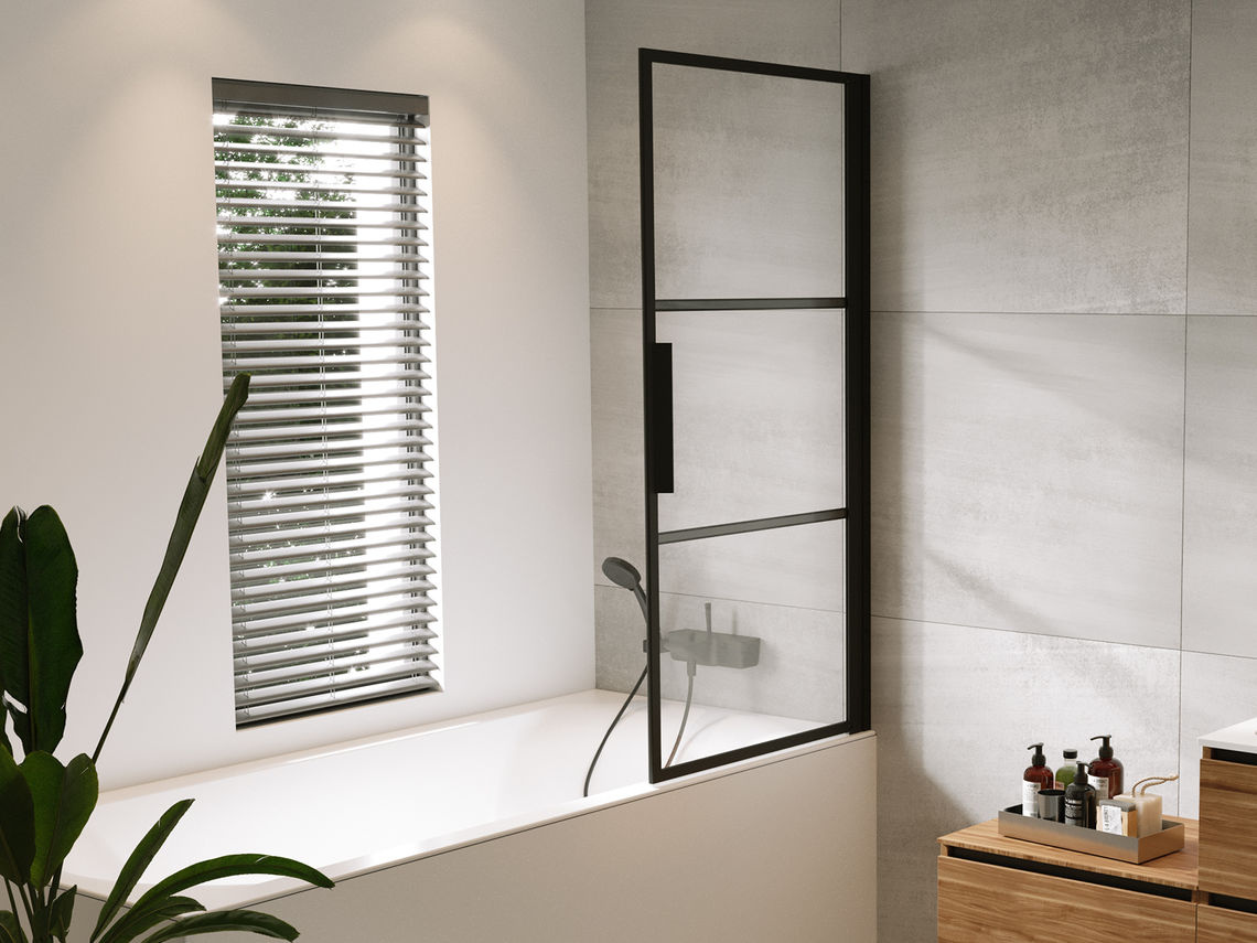 De Riho Grid GB501 is een mat zwarte badwand met een industriële look. Het glas is volledig ingesloten in gepoedercoat aluminium profielen, wat zorgt voor hoge stabiliteit en een moderne uitstraling. De horizontale metalen stroken aan de buitenkant verdelen het glas in drie vlakken, terwijl de maskerende opdruk aan de binnenzijde het schoonmaken vergemakkelijkt.