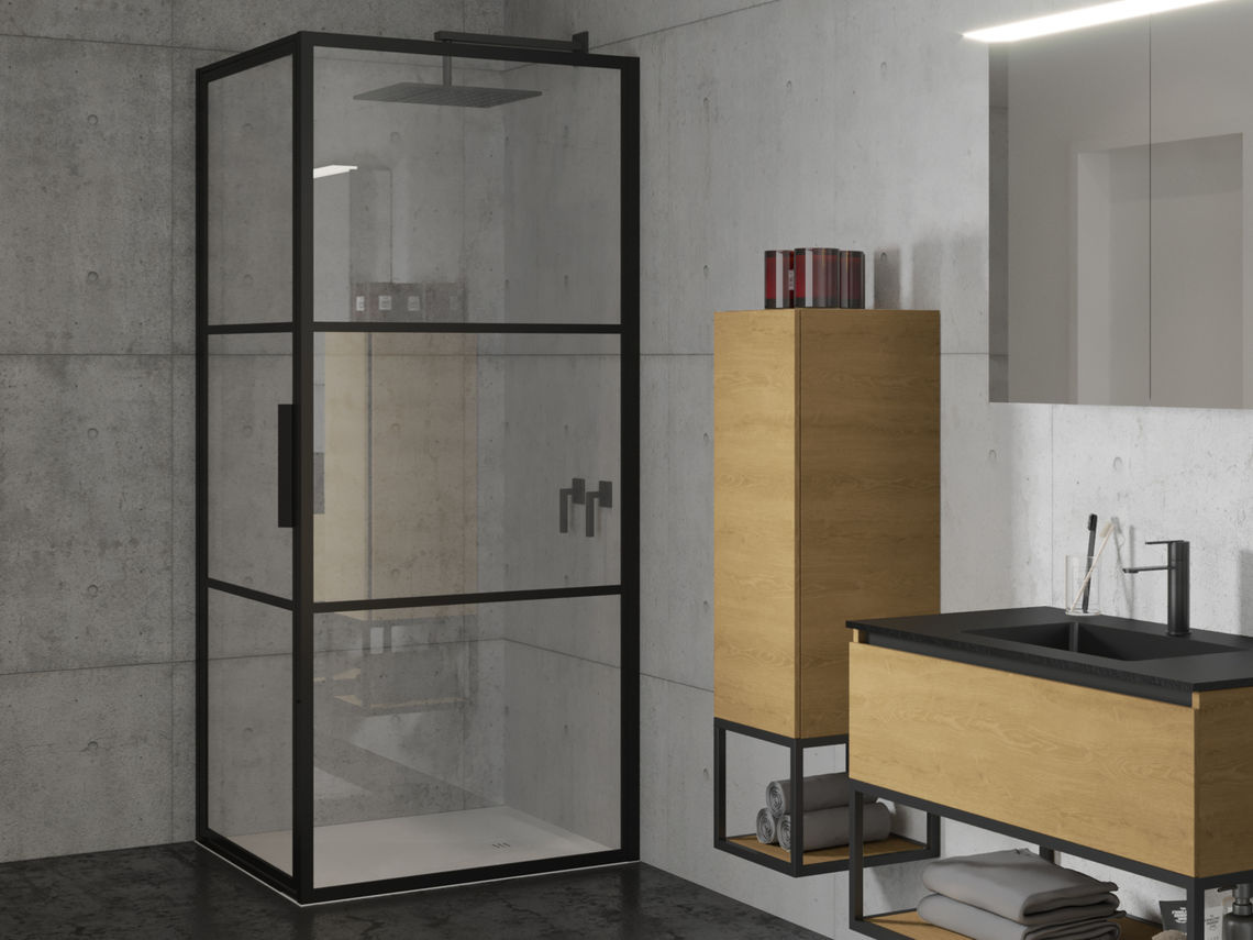 De Riho Grid GB201 douchecabine combineert een industriële uitstraling met praktische functionaliteit. De mat zwarte profielen van gepoedercoat aluminium zorgen voor een trendy look en duurzaamheid. Het glas, verdeeld door horizontale metalen stroken, heeft een unieke uitstraling en is eenvoudig schoon te houden dankzij de maskerende opdruk aan de binnenzijde.