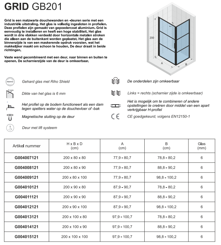 Het geharde glas van 6 mm dikte met Riho Shield coating biedt maximale veiligheid en vermindert kalkvorming. De deur draait in beide richtingen en heeft een magnetische sluiting voor een strakke afsluiting. Het lift systeem maakt openen en sluiten moeiteloos. Het bodemprofiel voorkomt water op de douchevloer of -bak. De omkeerbare scharnieren bieden flexibiliteit bij de installatie.