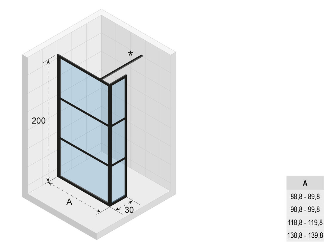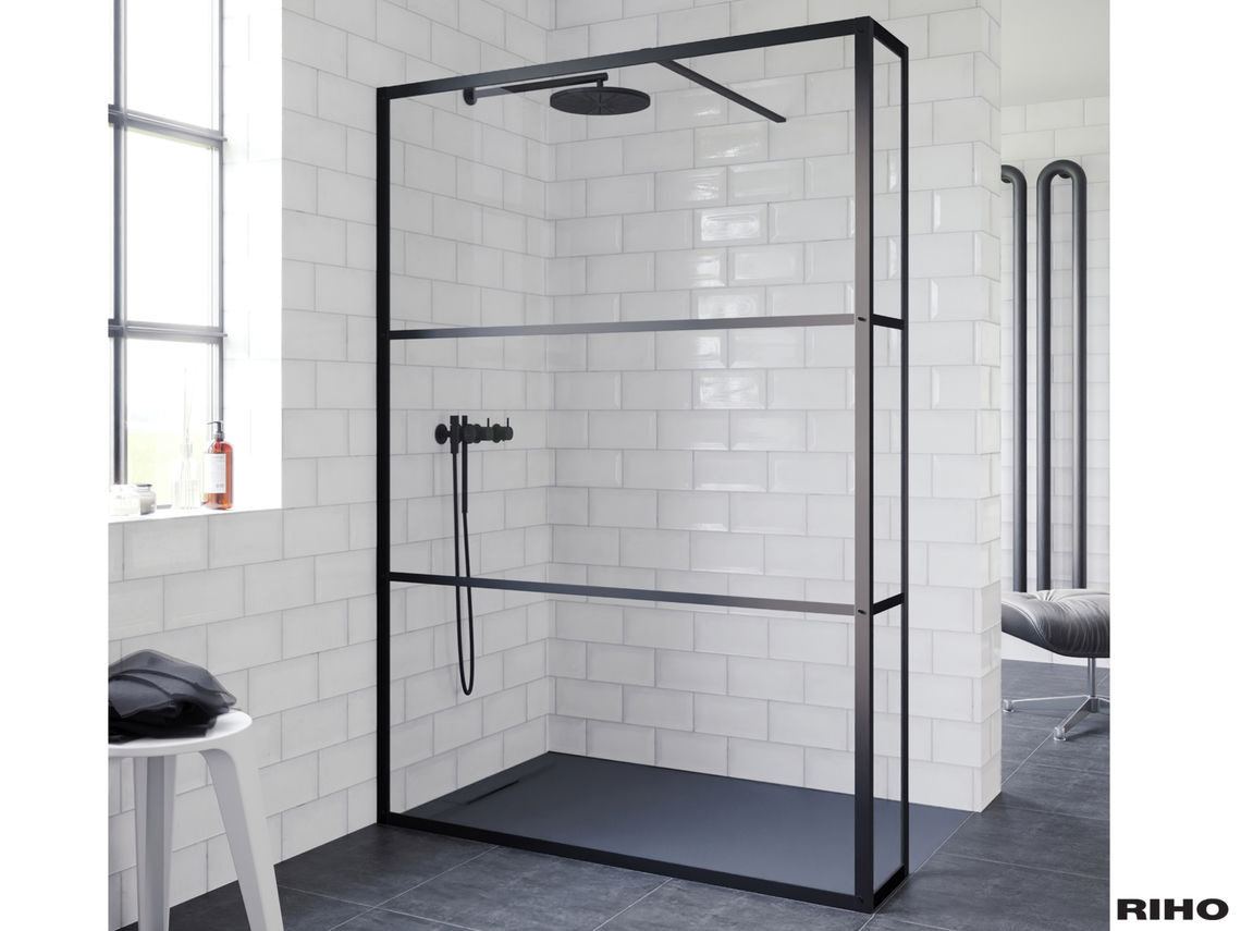 De Riho Grid GB402 inloopdouche combineert maximale ruimte en een stijlvolle industriële look met zijn mat zwarte profielen van gepoedercoat aluminium. Het glas is volledig ingesloten in profielen en verdeeld in drie vlakken door horizontale metalen stroken. De binnenzijde van het glas heeft een maskerende opdruk, wat het schoonmaken eenvoudig maakt.