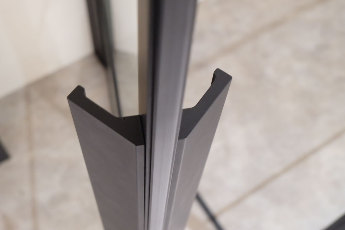De Riho Grid GB104 is een mat zwarte douchedeur die een stijlvolle, industriële uitstraling biedt. Het glas is volledig ingesloten in gepoedercoate aluminium profielen, wat zorgt voor hoge stabiliteit en duurzaamheid. De horizontale metalen stroken aan de buitenkant van het glas geven een uniek design, terwijl de maskerende opdruk aan de binnenkant het schoonmaken vergemakkelijkt.
