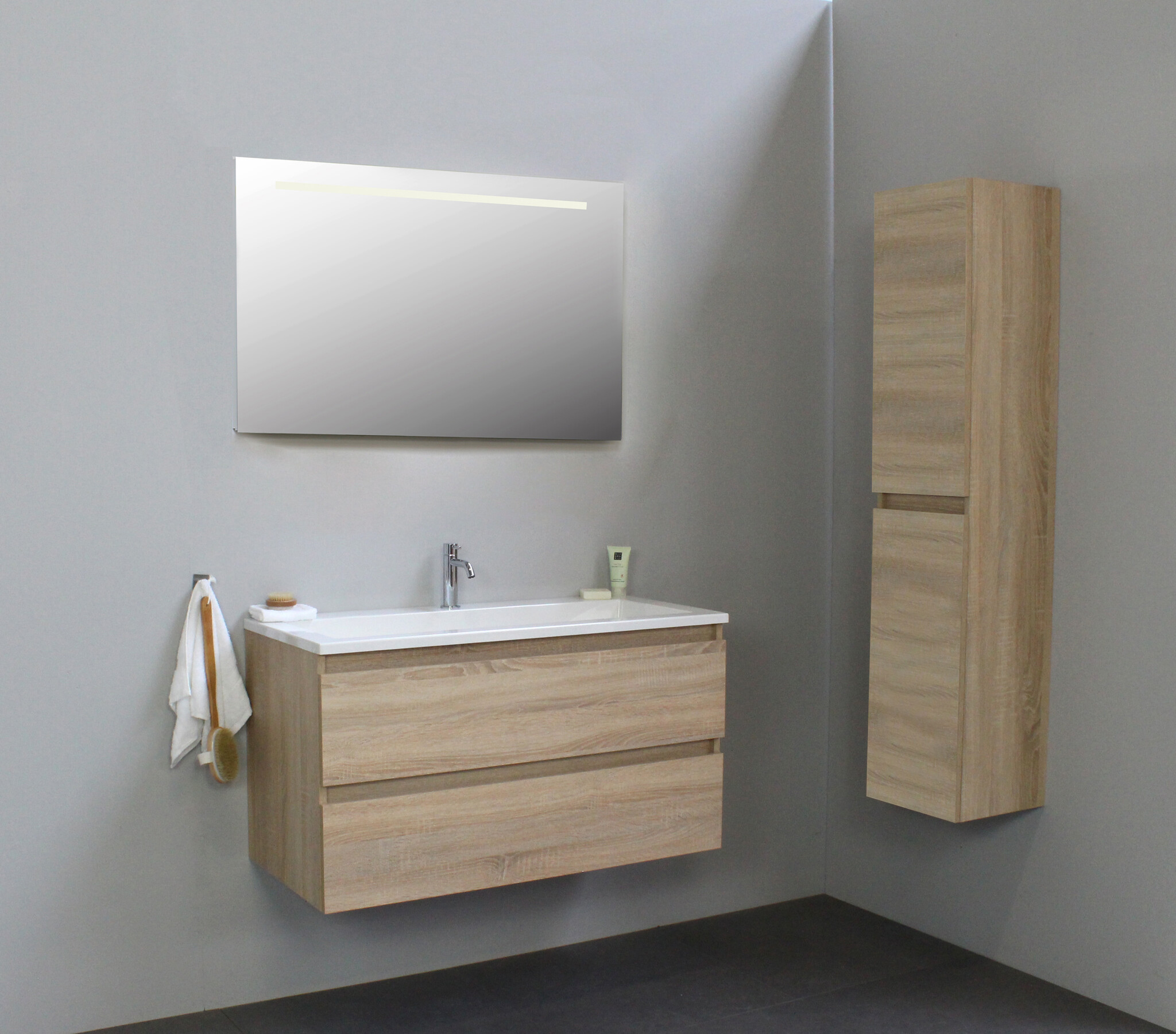 Offerte aanvraag voor Solidline badkamermeubelset | 100cm | Acryl | Wit | 1 | Eiken | Spiegel met LED verlichting | Bouwpakket
