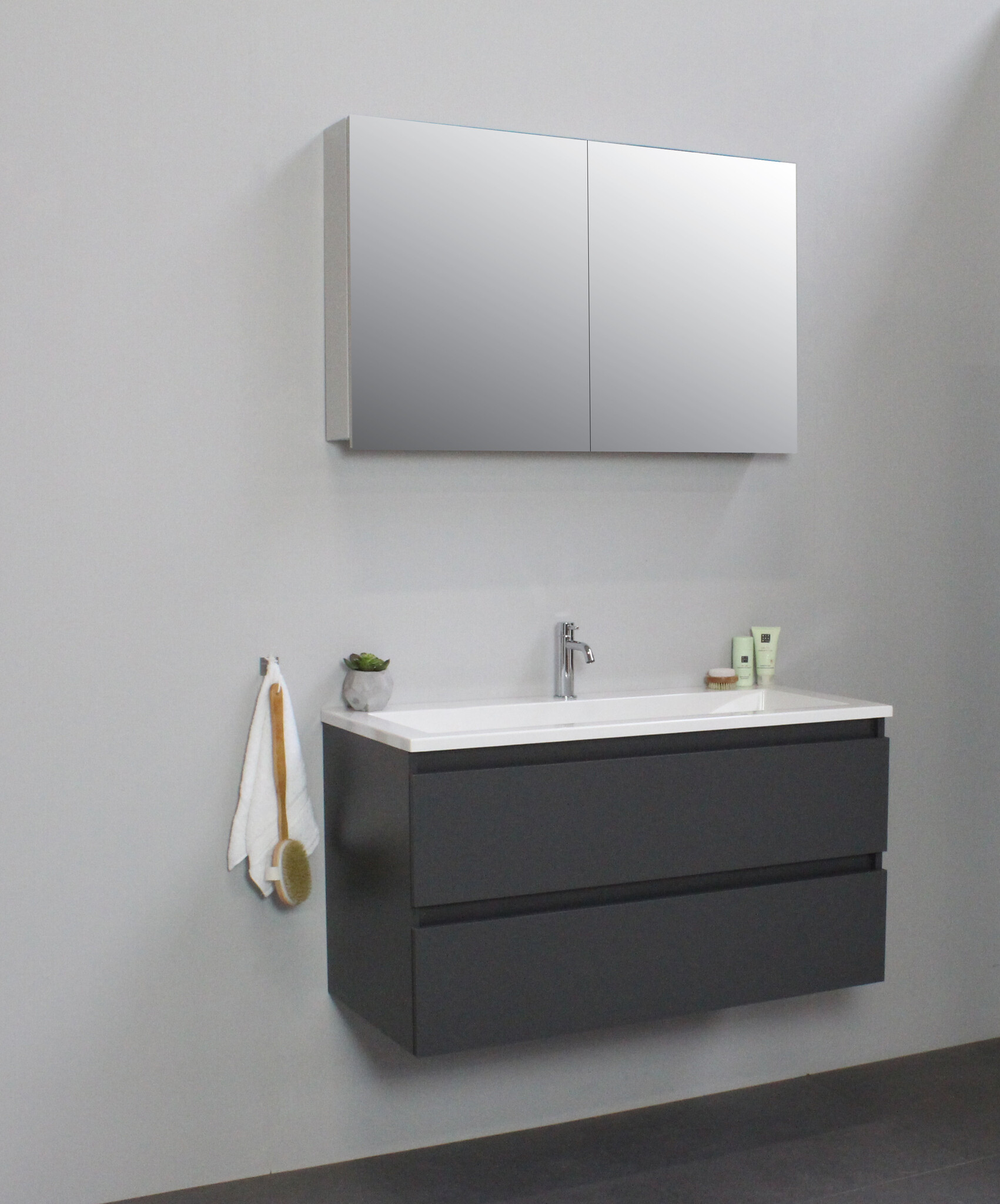 Solidline badkamermeubelset | 100cm | Acryl | Wit | 1 | Mat antraciet | Met spiegelkast | Bouwpakket