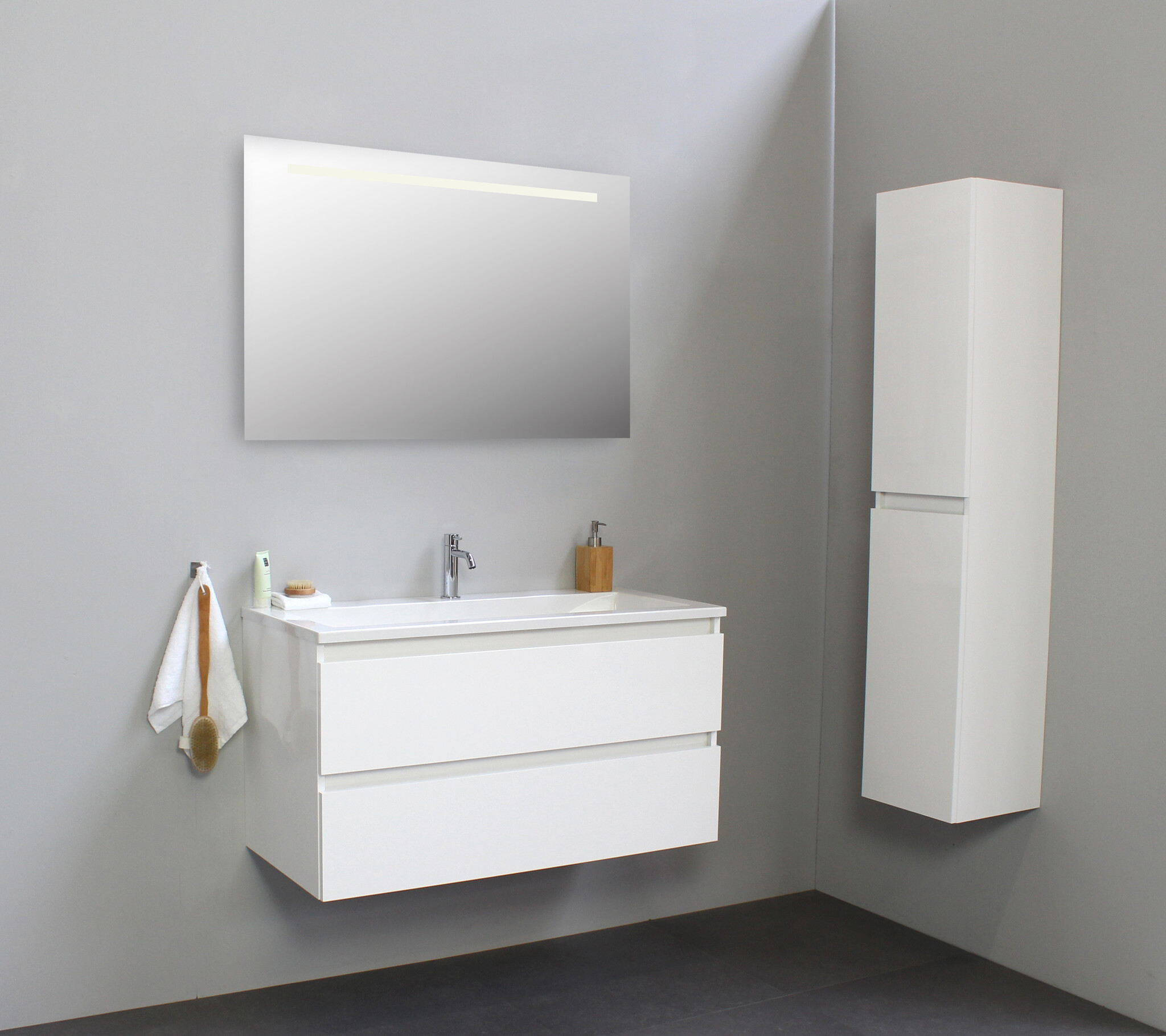 Solidline badkamermeubelset | 100cm | Acryl | Wit | 1 | Hoogglans wit | Spiegel met LED verlichting | Geassembleerd