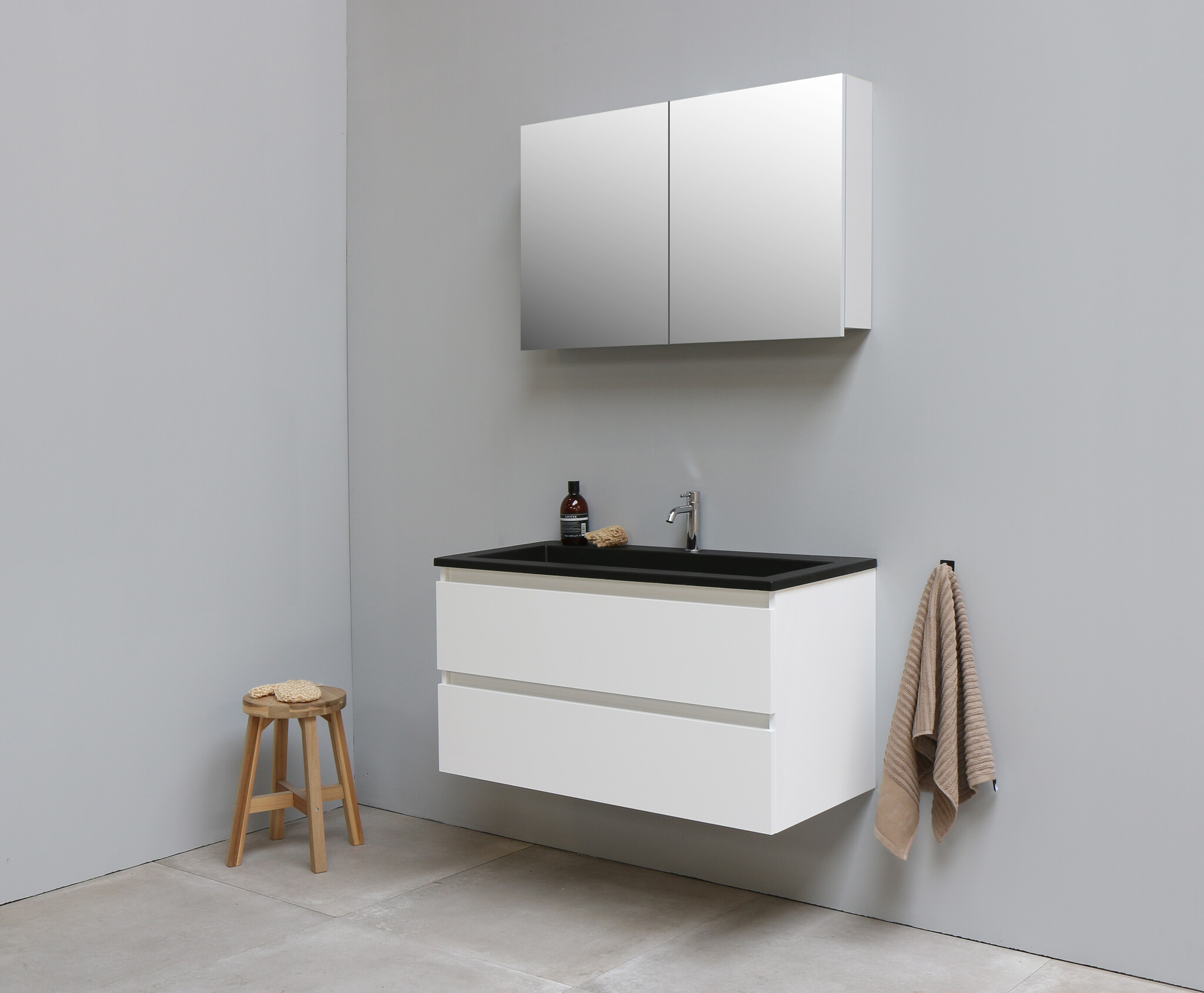 Solidline badkamermeubelset | 100cm | Acryl | Mat zwart | 1 | Hoogglans wit | Met spiegelkast | Geassembleerd