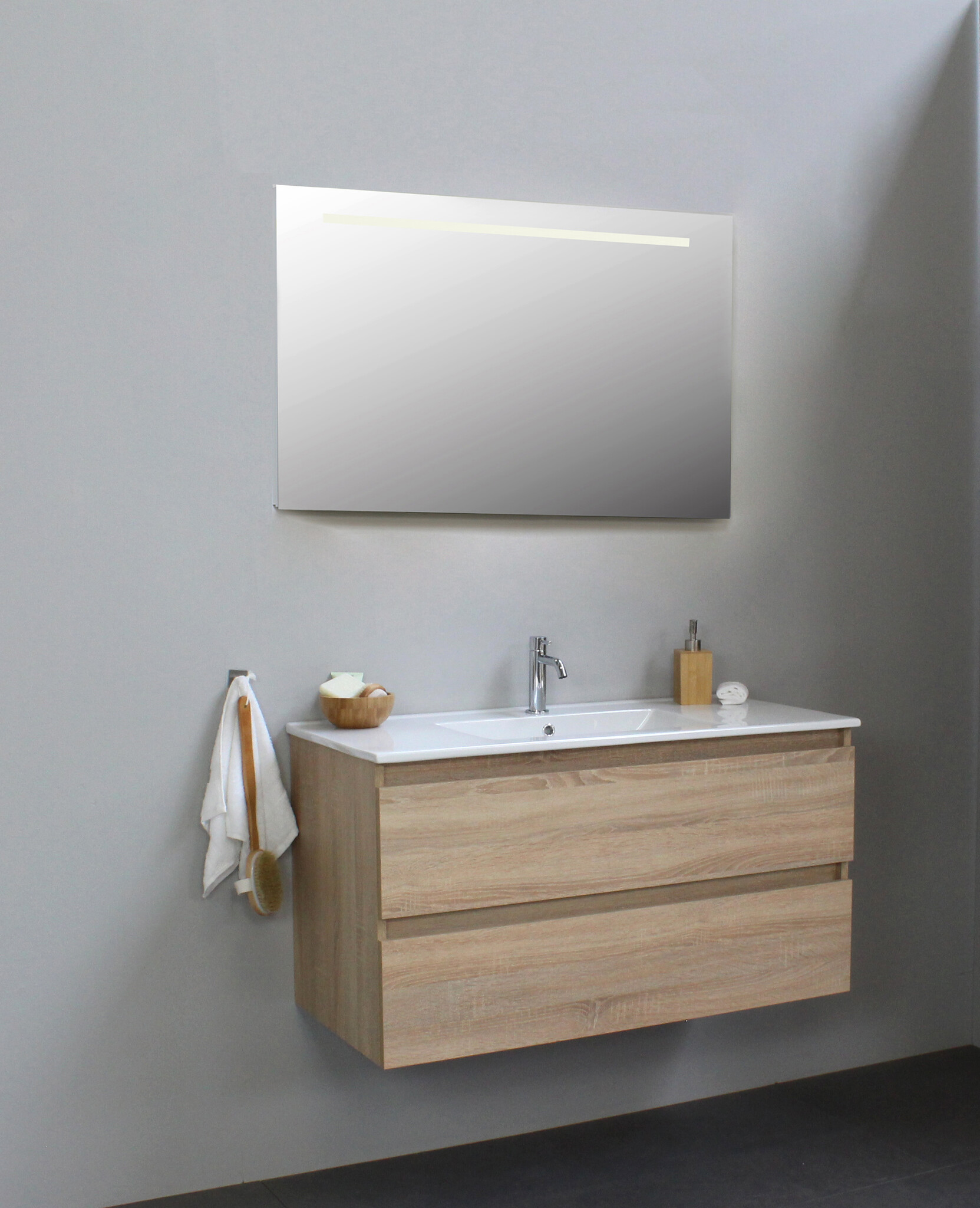 Solidline badkamermeubelset | 100cm | Keramiek | Wit | 1 | Eiken | Spiegel met LED verlichting | Bouwpakket