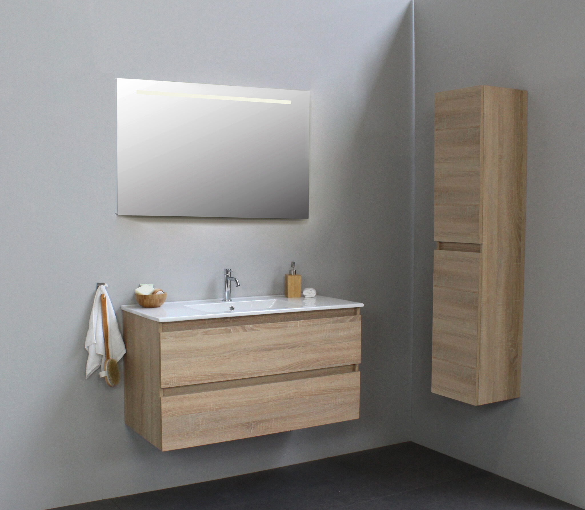 Solidline badkamermeubelset | 100cm | Keramiek | Wit | 1 | Eiken | Spiegel met LED verlichting | Geassembleerd