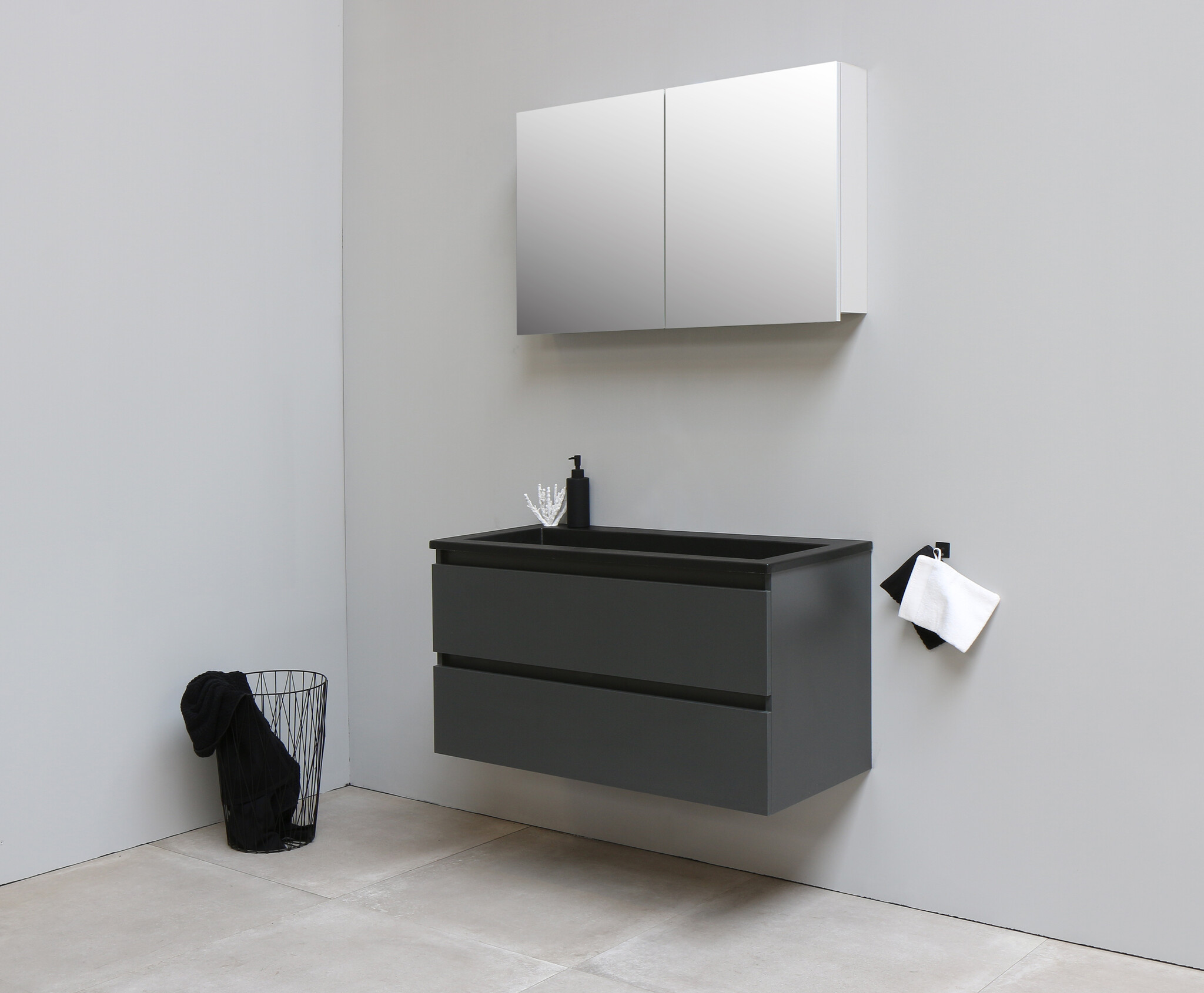 Solidline badkamermeubelset - 100cm - Keramiek - Mat zwart - 0 - Mat antraciet - Met spiegelkast - Geassembleerd