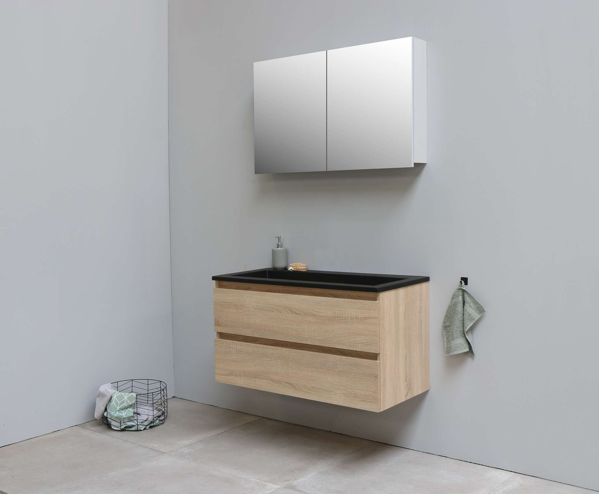 Solidline badkamermeubelset - 100cm - Keramiek - Mat zwart - 1 - Eiken - Met spiegelkast - Bouwpakket