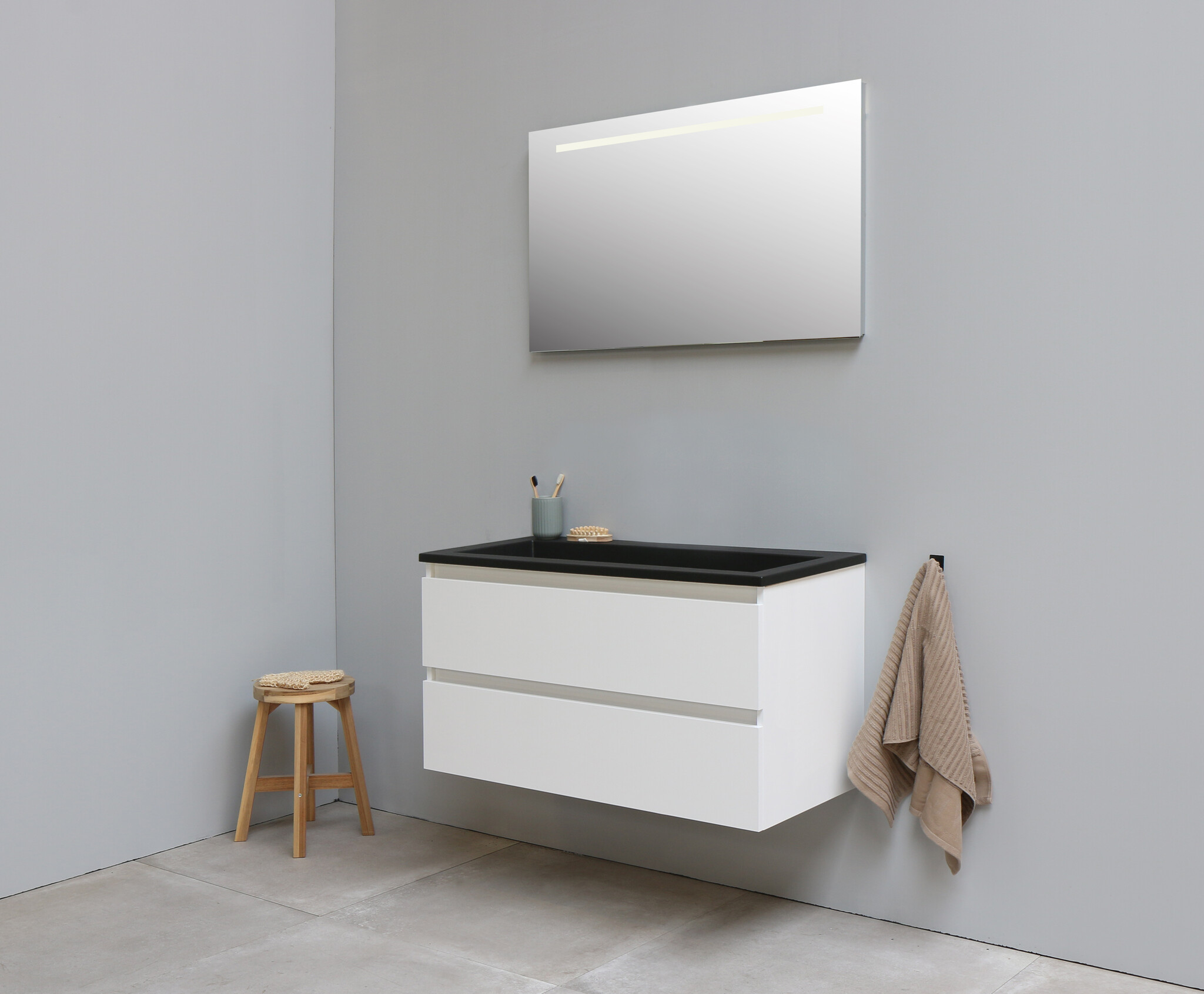 Solidline badkamermeubelset | 100cm | Keramiek | Mat zwart | 1 | Hoogglans wit | Spiegel met LED verlichting | Geassembleerd