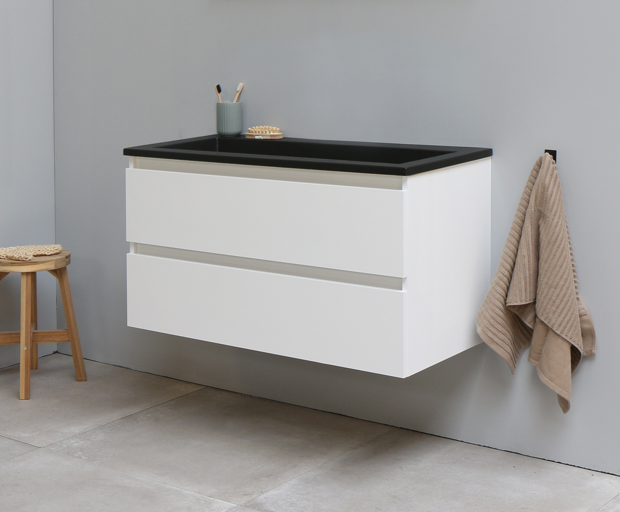 Solidline badkamermeubelset | 100cm | Keramiek | Mat zwart | 1 | Hoogglans wit | Zonder spiegel | Geassembleerd