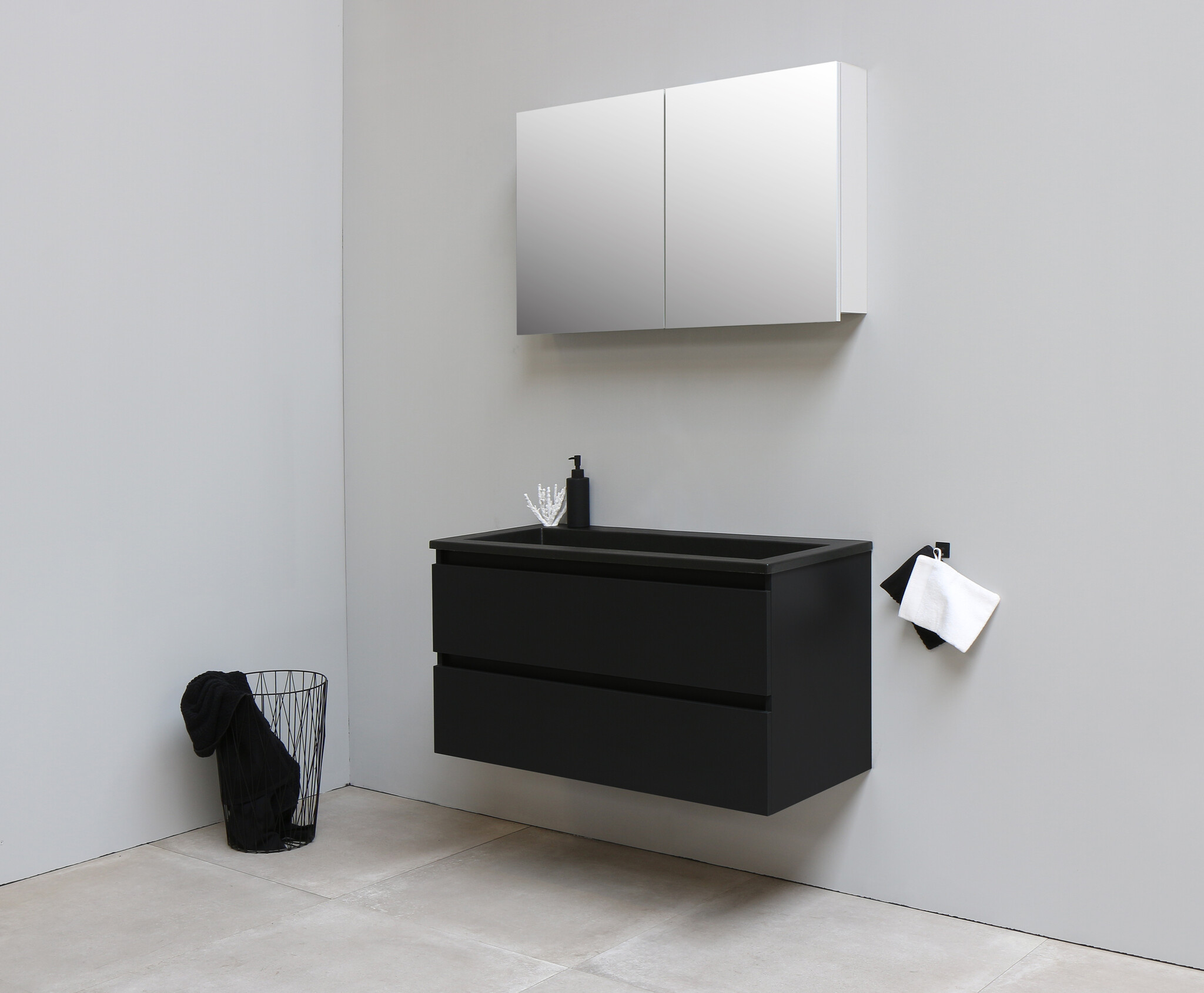 Solidline badkamermeubelset | 100cm | Keramiek | Mat zwart | 1 | Mat zwart | Met spiegelkast | Bouwpakket