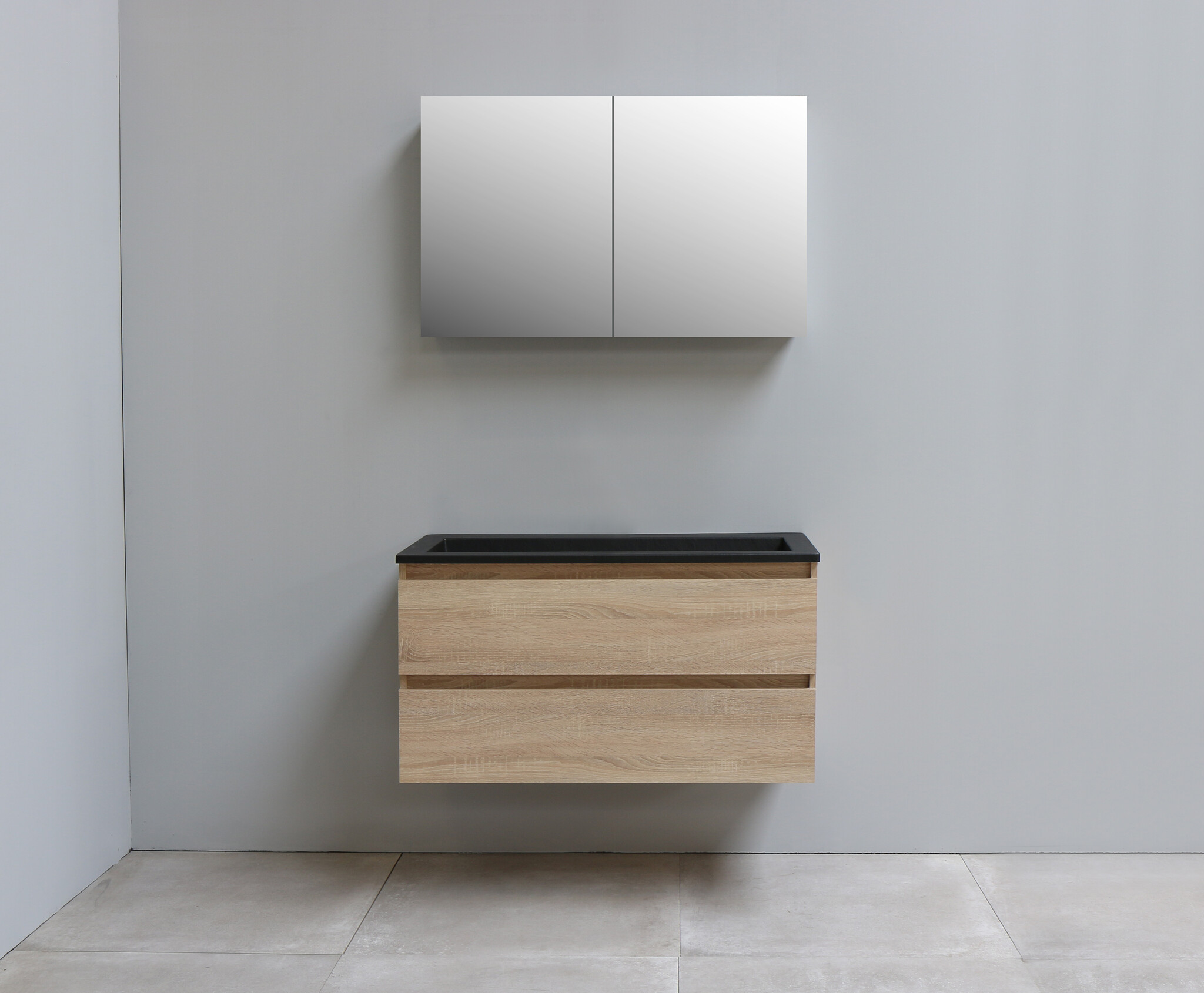 Solidline badkamermeubelset | 100cm | Keramiek | Mat zwart | 2 | Eiken | Met spiegelkast | Bouwpakket